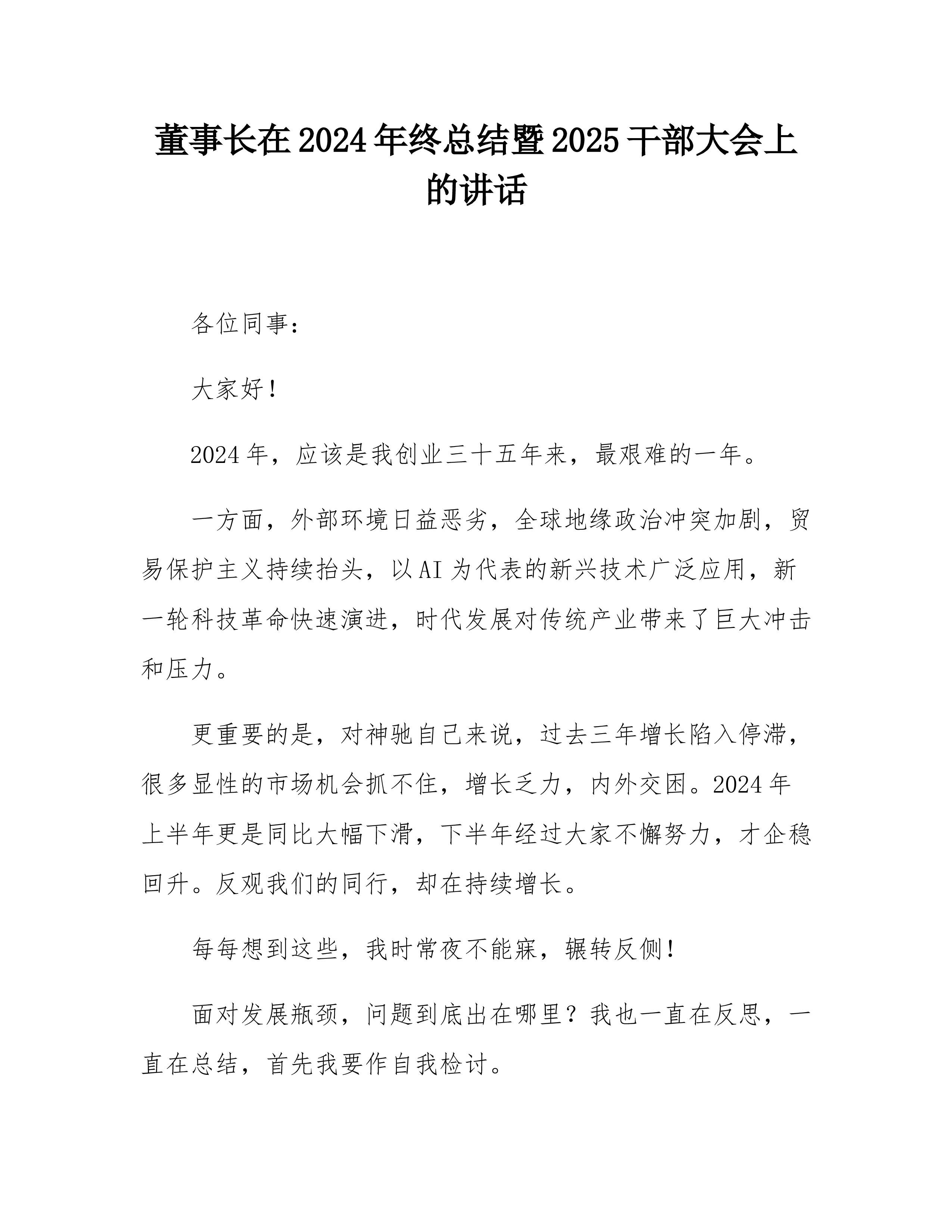 董事长在2024年终总结暨2025干部大会上的讲话各位同事:大家好!2024年,应该是我创业三十五年来,最艰难的一年。一方面,外部环境日益恶劣,全球地缘政治冲突加剧,贸易保护主义持续抬头,以AI为代表的新兴技术广泛应用,新一轮科技革命快速演进,时代发展对传统产业带来了巨大冲击和压力。更重要的是,对神驰自己来说,过去三年增长陷入停滞,很多显性的市场机会抓不住,增长乏力,内外交困。2024年上半年更是同比大幅下滑,下半年经过大家不懈努力,才企稳回升。反观我们的同行,却在持续增长。每每想到这些,我时常夜不能寐,辗转反侧!面对发展瓶颈,问题到底出在哪里?我也一直在反思,一直在总结,首先我要作自我检讨。...