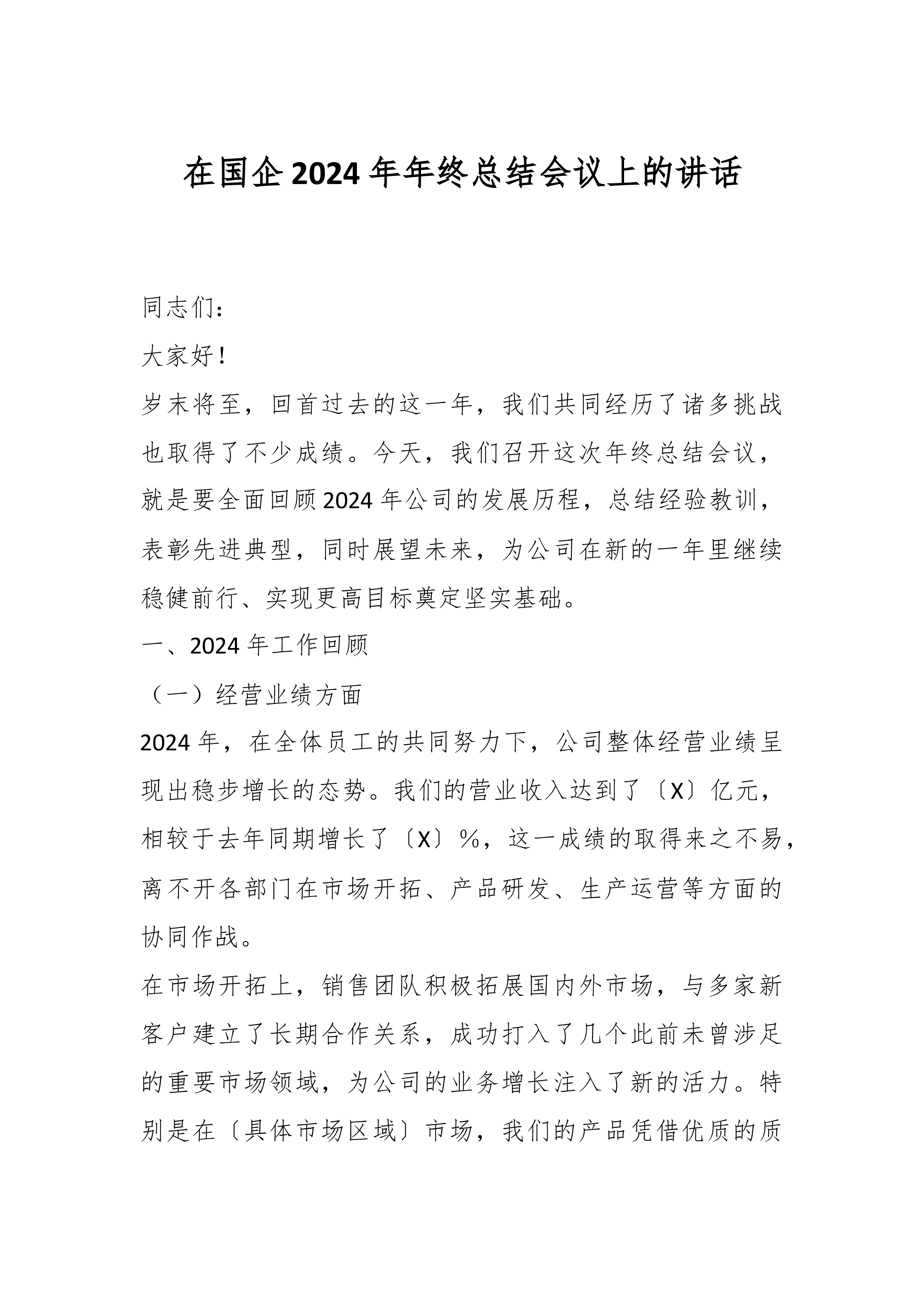 在国企2024年年终总结会议上的讲话同志们:大家好!岁末将至,回首过去的这一年,我们共同经历了诸多挑战也取得了不少成绩。今天,我们召开这次年终总结会议,就是要全面回顾2024年公司的发展历程,总结经验教训,表彰先进典型,同时展望未来,为公司在新的一年里继续稳健前行、实现更高目标奠定坚实基础。一、2024年工作回顾(一)经营业绩方面2024年,在全体员工的共同努力下,公司整体经营业绩呈现出稳步增长的态势。我们的营业收入达到了〔X〕亿元,相较于去年同期增长了〔X〕%,这一成绩的取得来之不易,离不开各部门在市场开拓、产品研发、生产运营等方面的协同作战。在市场开拓上,销售团队积极拓展国内外市场,与多家...
