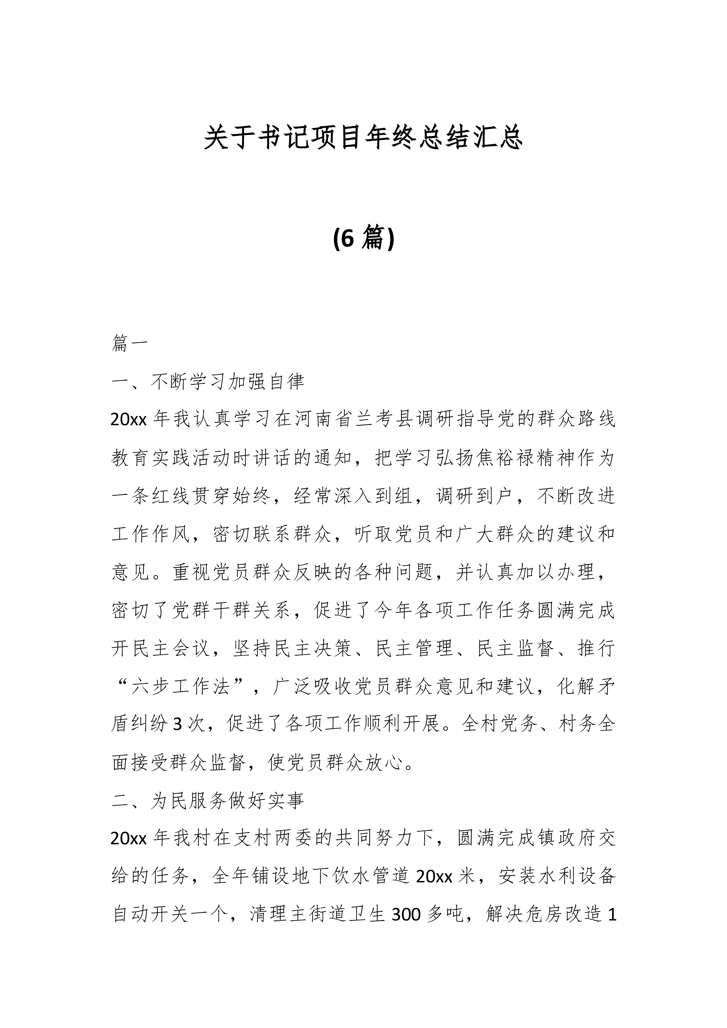 关于书记项目年终总结汇总(6篇)篇一一、不断学习加强自律20xx年我认真学习在河南省兰考县调研指导党的群众路线教育实践活动时讲话的通知,把学习弘扬焦裕禄精神作为一条红线贯穿始终,经常深入到组,调研到户,不断改进工作作风,密切联系群众,听取党员和广大群众的建议和意见。重视党员群众反映的各种问题,并认真加以办理,密切了党群干群关系,促进了今年各项工作任务圆满完成开民主会议,坚持民主决策、民主管理、民主监督、推行“六步工作法”,广泛吸收党员群众意见和建议,化解矛盾纠纷3次,促进了各项工作顺利开展。全村党务、村务全面接受群众监督,使党员群众放心。二、为民服务做好实事20xx年我村在支村两委的共同努力下...