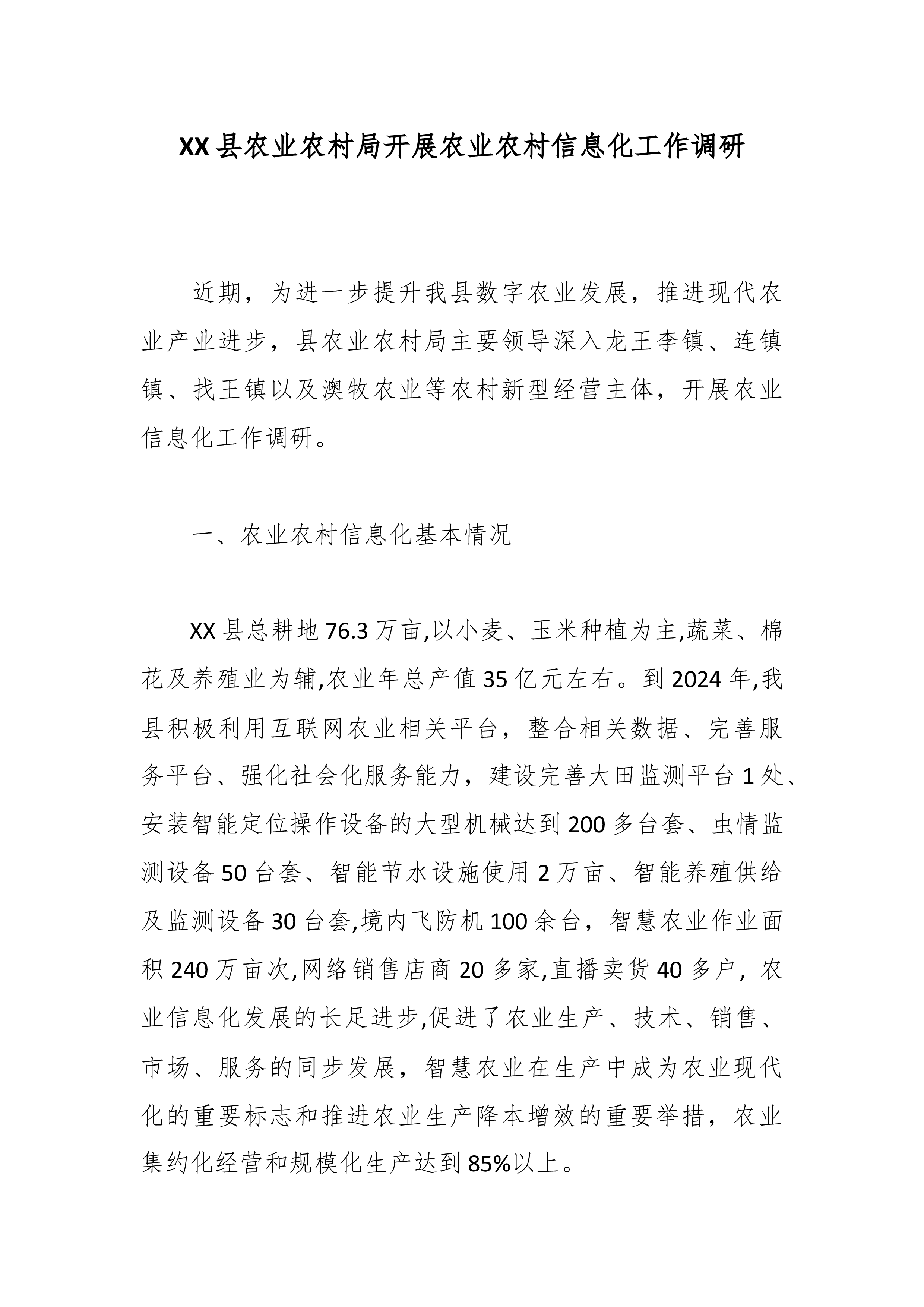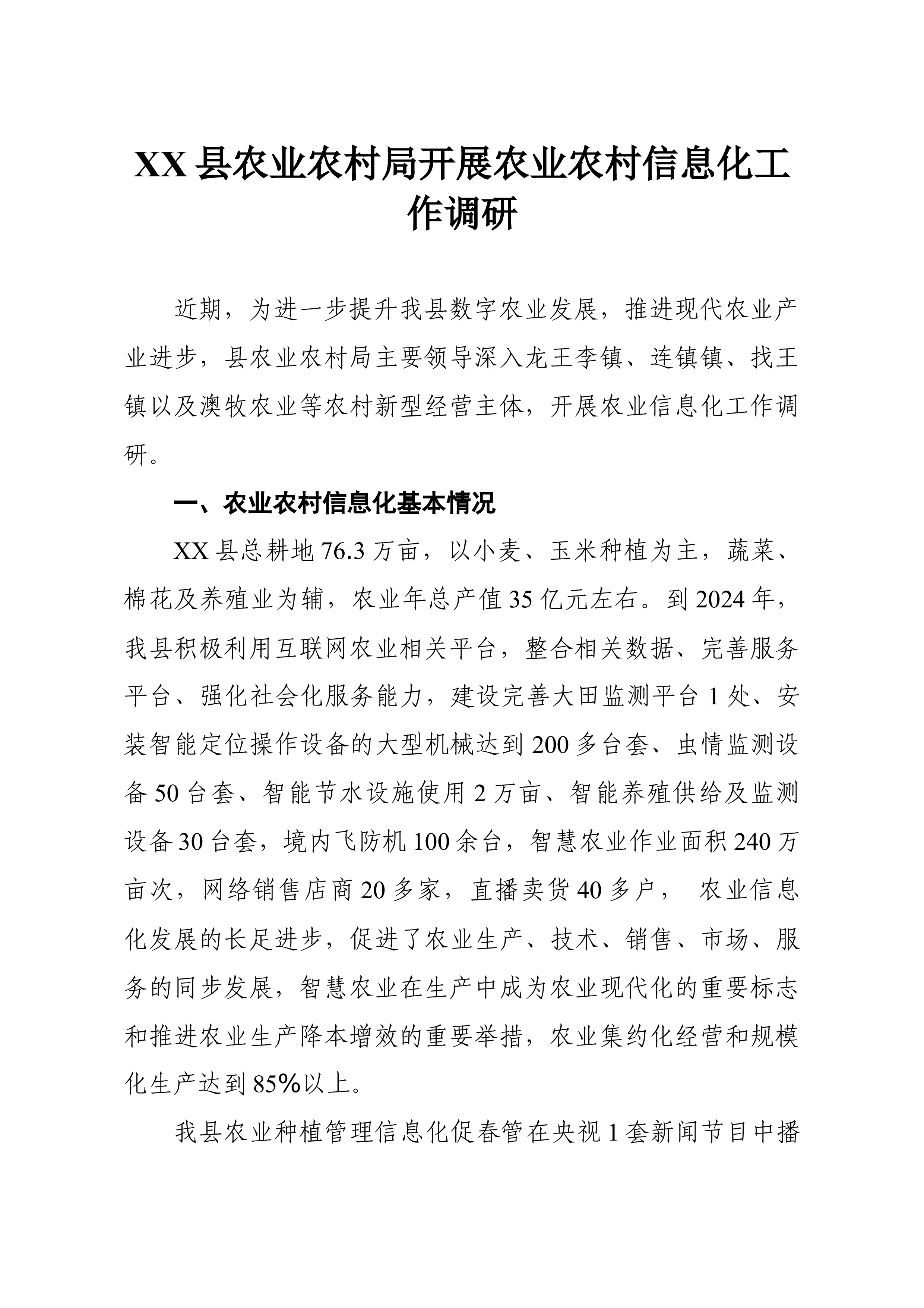 XX县农业农村局开展农业农村信息化工作调研 近期,为进一步提升我县数字农业发展,推进现代农业产业进步,县农业农村局主要领导深入龙王李镇、连镇镇、找王镇以及澳牧农业等农村新型经营主体,开展农业信息化工作调研。 一、农业农村信息化基本情况 XX县总耕地76.3万亩,以小麦、玉米种植为主,蔬菜、棉花及养殖业为辅,农业年总产值35亿元左右。到2024年,我县积极利用互联网农业相关平台,整合相关数据、完善服务平台、强化社会化服务能力,建设完善大田监测平台1处、安装智能定位操作设备的大型机械达到200多台套、虫情监测设备50台套、智能节水设施使用2万亩、智能养殖供给及监测设备30台套,境内飞防机100余台,智慧农业作业面积240万亩次,网络销售店商20多家,直播卖货40多户, 农业信息化发展的长足...