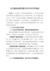 XX县农业农村局2025年工作总结(精品)2025年,在县委、县政府的坚强领导下,县农业农村局坚持以新时代中国特色社会主义思想为指导,深入贯彻落实中央关于“三农”工作的决策部署,紧紧围绕乡村振兴战略总目标,聚焦农业高质高效、乡村宜居宜业、农民富裕富足,全力以赴抓落实、求突破,全县农业农村发展保持稳中向好、进中提质的良好态势。一、2025年主要工作成效(一)农业生产稳中有进,粮食安全基础更加坚实始终把保障粮食安全放在首要位置,全面落实粮食安全党政同责,压实责任,强化措施,全年农业生产再获丰收。一是粮食产量再创新高。全县粮食播种面积稳定在XX万亩,总产达到XX万吨,同比增长X%。其中,小麦、玉米等主要作物单产水平稳步提升,高标准农田建设持续推进,有效灌溉面积进一步扩大,为粮食稳产增产奠定了坚实基...