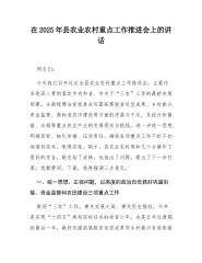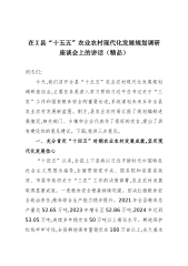 在X县“十五五”农业农村现代化发展规划调研座谈会上的讲话(精品)同志们: 今天,我们召开全县“十五五”农业农村现代化发展规划调研座谈会,主要任务是深入学习贯彻习近平总书记关于“三农”工作和国家粮食安全的重要论述,系统谋划未来五年全县农业农村发展新蓝图。刚才,县农业农村局汇报了规划编制进展情况,相关部门、乡镇和企业代表作了很好的发言,提出了具有建设性的意见建议。下面,我讲三点意见。 一、充分肯定“十四五”时期农业农村发展成就,坚定现代化发展信心 “十四五”以来,全县上下坚持以习近平新时代中国特色社会主义思想为指导,全面贯彻党中央、国务院和省委省政府、市委市政府关于“三农”工作的决策部署,农业农村发展取得显著成效。一是粮食安全根基持续巩固。坚决扛稳粮食安全政治责任,粮食综合生产能力稳步提升...