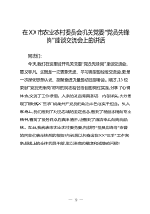 在XX“市农业农村委员会机关党委党员先锋”岗座谈交流会上的讲话同志们:今天,“”我们在这里召开机关党委党员先锋岗座谈交流会,意义非凡。这既是一次表彰先进、学习典型的经验交流会,更是一次深化思想认识、凝聚奋进力量的动员部署会。刚才,15位“”荣获党员先锋岗称号的同志结合各自的岗位实践,分享了心得体会,交流了工作感悟。大家的发言情真意切、内容详实,充分展现了新时代XX“”三农战线共产党员的政治本色与实干担当。从大家身上,我们看到了对党忠诚的坚定信念,看到了精益求精的专业精神,看到了服务群众的真挚情怀,也看到了廉洁奉公的高尚品格。在此,我代表市农业农村委党委,“”向获得党员先锋岗荣誉的同志们表示热烈的祝贺!向长期以来奋战在XX“”三农工作各条战线上的全体党员干部,致以崇高的敬意和诚挚的问候!—19...