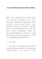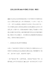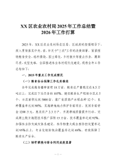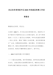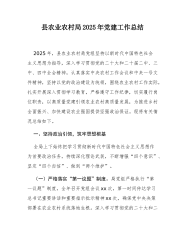 县农业农村局2025年党建工作总结(精品)2025年,县农业农村局党组坚持以习近平新时代中国特色社会主义思想为指导,深入学习贯彻党的二十大和二十届二中、三中、四中全会精神,认真落实中央农村工作会议和中央一号文件精神,坚持以党的政治建设为统领,围绕农业农村工作实际,深入开展中央八项规定精神学习教育,严格遵守工作纪律,切实履行岗位职责,以高质量党建引领农业农村高质量发展,为推进乡村全面振兴、加快建设农业强国提供坚强政治保证。现将有关情况总结如下。一、坚持政治引领,筑牢思想根基全局上下始终把学习贯彻习近平新时代中国特色社会主义思想作为首要政治任务,持续深化理论武装,不断增强"四个意识"、坚定"四个自信"、做到"两个维护"。一是严格落实"第一议题"制度。局党组严格执行"第一议题"制度,全年召开党组会...