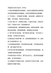 “风险意识”排比句金句(40组)1.对新生事物要保持足够敬畏,对苗头问题要保持足够审慎,对各类舆情要保持足够敏感,对潜在风险要保持足够清醒。2.“不忘初心、方得始终”的清醒,“如临深渊、如履薄冰”的警醒,“君子检身、常若有过”的自省。3.不是小事小节,而是重大风险;不是杯水风波,而是滔天巨浪;不是战斗失利,而是战略失误。4.精明是鼠的眼,能明察眼前的食物;高明是虎的眼,能觉察近处的猎物;英明是鹰的眼,能洞察远方的风物。5.“望”行察“色”找问题,“闻”音嗅“味”摸问题,“问”症谈“心”挖问题,“切”脉识“疾”找症结。6.把情况估计得更严峻一些,把形势看得更复杂一些,把准备工作做得更扎实一些。7...
