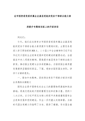 在市国资委党委所属企业基层党组织党务干部综合能力素质提升专题培训班上的开班讲话同志们:今天,我们在这里举办市国资委党委所属企业基层党组织党务干部综合能力素质提升专题培训班,主要任务是深入学习贯彻党的XX大、二十届三中全会精神和习近平总书记关于国有企业改革发展和党的建设的重要论述,全面落实中央八项规定精神,聚焦提升基层党务干部综合能力素质,推动国企党建与业务深度融合,为国资国企高质量发展提供坚强组织保证。下面,我结合国资国企实际,讲四个方面的意见。一、紧扣中央精神,深刻领会党务干部能力培训对国企发展的关键意义国有企业是中国特色社会主义的重要物质基础和政治基础,是我们党执政兴国的重要支柱和依靠力量。党的十八大以来,以习近平同志为核心的党中央高度重视国有企业改革发展和党的建设,作出一系列重大决策部...