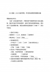 XX党校(XX行政学院)学员培训需求调查问卷尊敬的各位学员:为进一步深化教学改革,不断完善干部教育培训计划生成机制,满足学员的不同培训需求,提高干部培训质量和效益,我们设计了这份调查问卷。请您在相应的选项前的“□”内画“√”,部分可多选。1.您的工作单位:□党群部门□人大、政协机关□政府部门□事业单位□企业□其他2.您的最高学历:□中专以下□大专□大学□硕士研究生以上3.您的职务级别:□厅级□处级□科级□其他4.您过去3年参加过的培训有:□党校、行政学院培训□委托高校培训□专题讲座□业务培训□区外干部学院、干部培训机构□其他5.您参加培训最想了解和掌握的理论与知识(限选5项):□马克思主义基本...