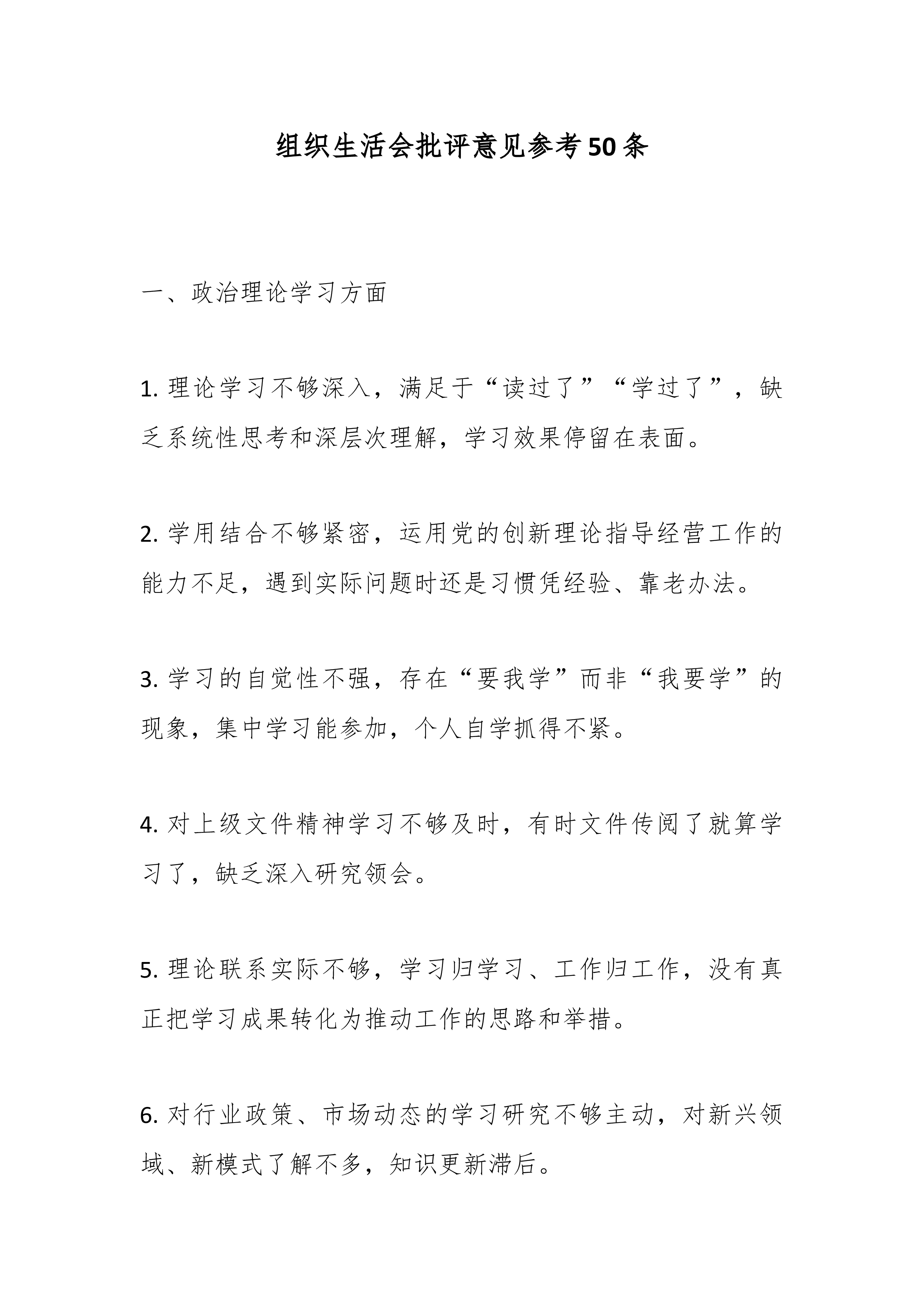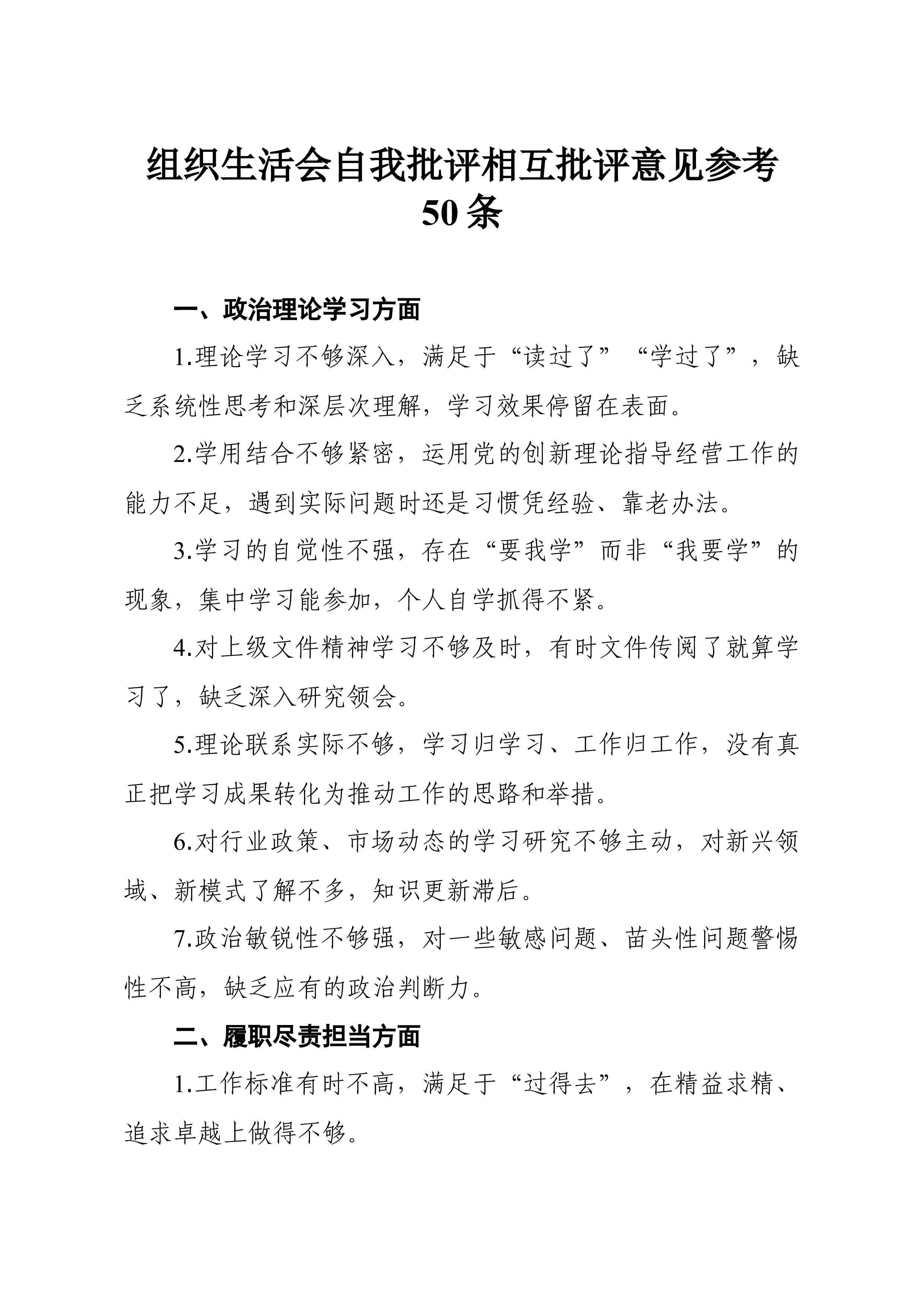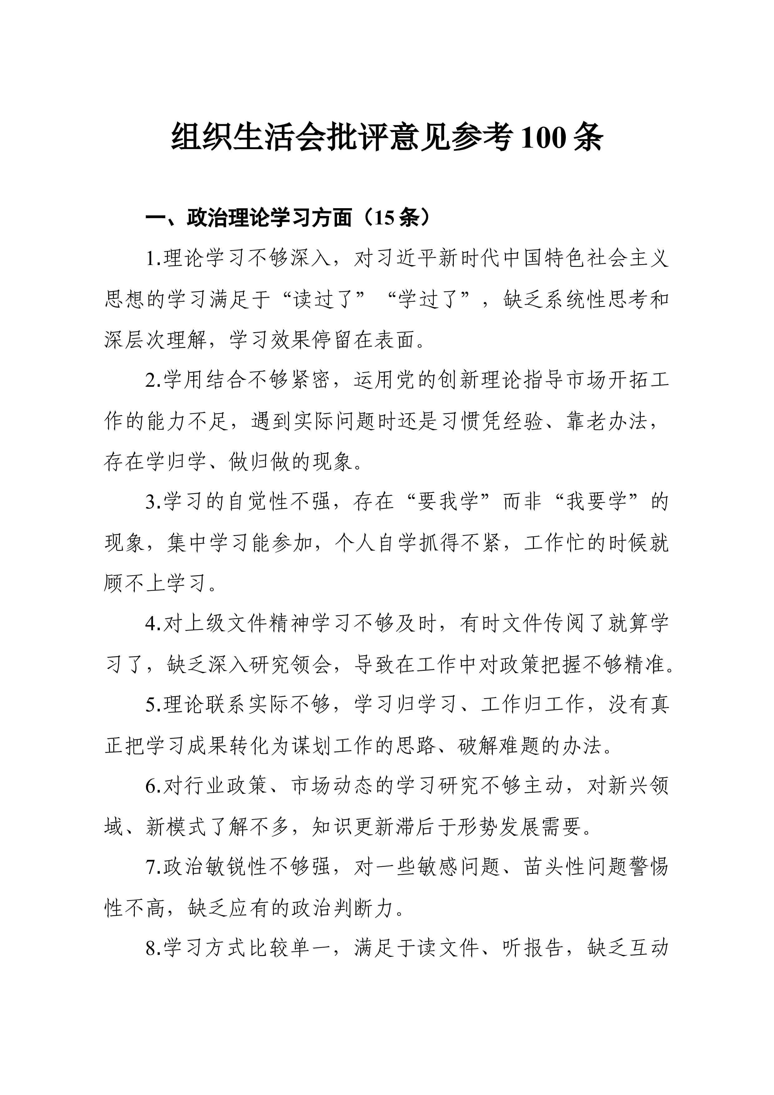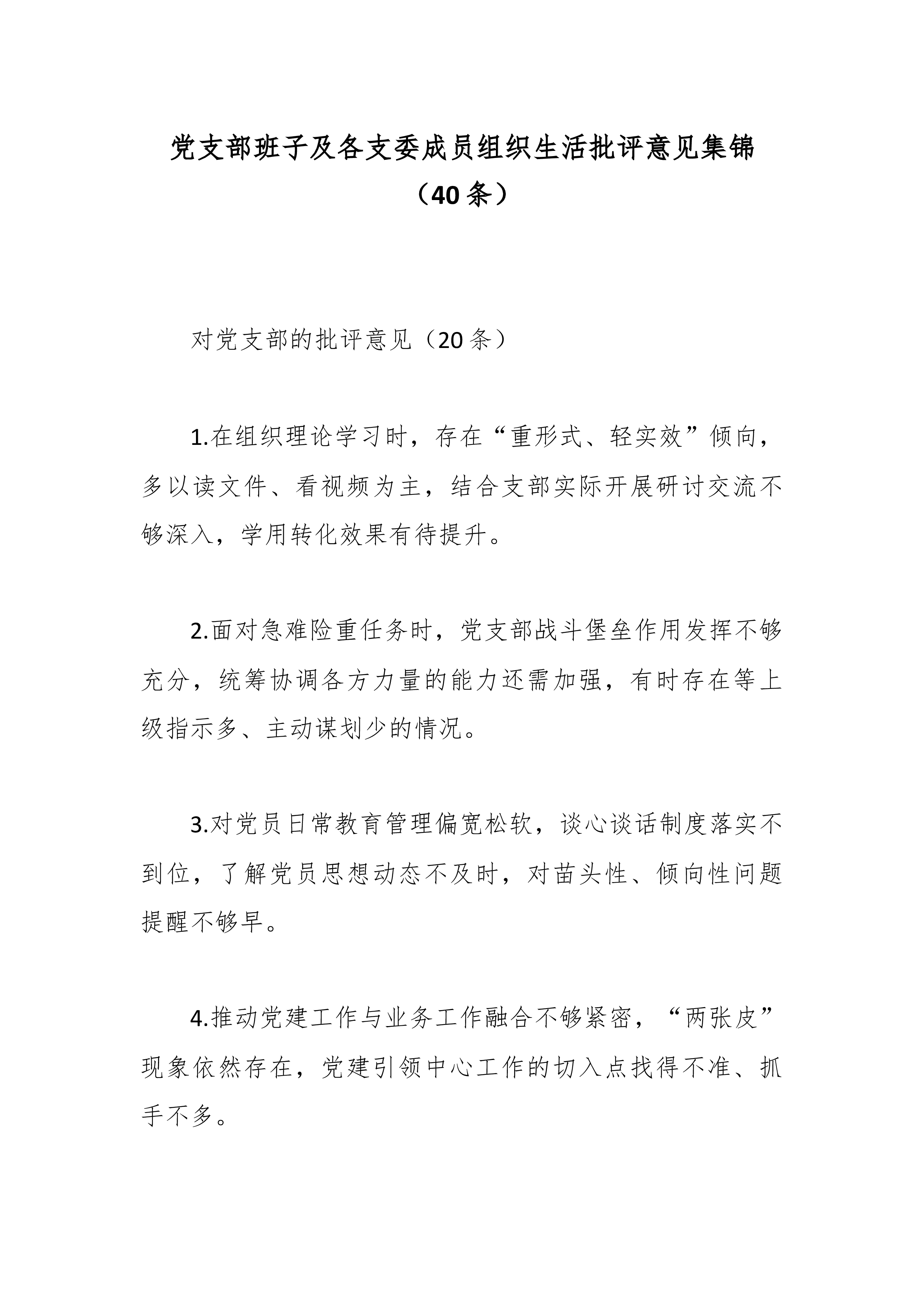 2026年民主生活会、组织生活会批评与互相批评意见汇编(全)1.2026年民主生活会、组织生活会批评与互相批评意见集锦(79条)2.2026年度组织生活会对镇党支部及支委成员的批评意见3.2026年民主生活会班子成员对主要负责同志的批评意见4.2026年民主生活会对上级班子及成员的批评意见建议5.2026年民主生活会主要负责同志对班子成员的批评意见6.班子成员2026年度民主生活会相互批评意见汇编7.对机关党支部及支委成员2026年度组织生活的批评意见8.2026年对上级班子及成员的批评意见建议(63条)9.在2026年度专题民主生活会上的相互批评意见清单2026年民主生活会、组织生活会批评与互相批评意见集锦(79条)1.政治理论学习系统性不足,学用结合不够紧密党支部在组织党员开展政治理论学...