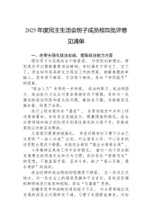 2025年民主生活会区委常委班子成员相互批评意见(精品)一、张吉惟同志对其他班子成员的批评意见(一)对林国瑞同志的批评意见。国瑞同志,您作为区长,抓经济发展的劲头和魄力大家有目共睹,成效显著。但有时感觉,在追求项目快速落地和短期经济指标增长的同时,对一些打基础、利长远的“潜绩”工程,比如城市文化底蕴的挖掘、生态环境保护的长效机制建设等方面,投入的精力和耐心略显不足。建议在统筹当前与长远发展上,能有更均衡的考量,避免急于求成的心态,为xx区的可持续发展夯实更稳固的基础,这同样是贯彻新发展理念、体现政治能力的具体要求。(二)对林玟书同志的批评意见。玟书同志,您分管党建和乡村振兴工作,认真负责,很有章法。但有时感觉,在推动基层党建工作时,对上级文件的解读和执行比较到位,但在结合我区各镇街、各村居的...