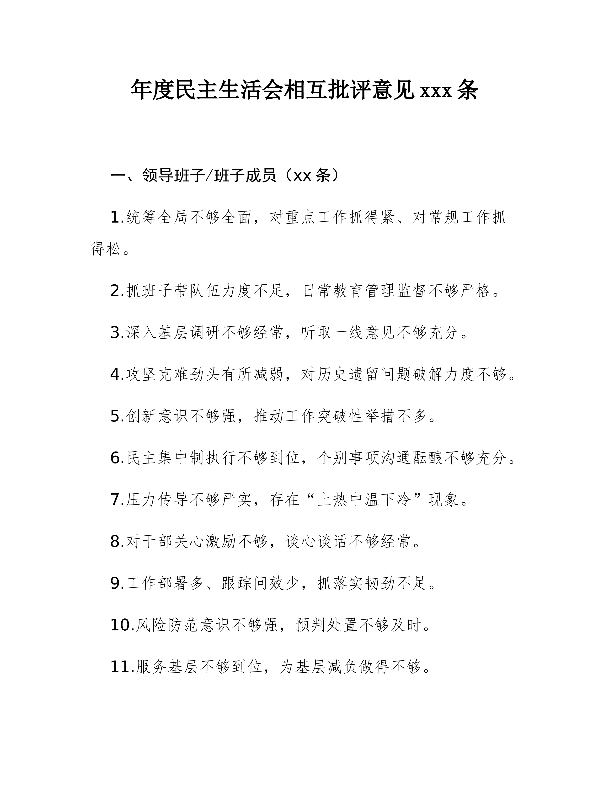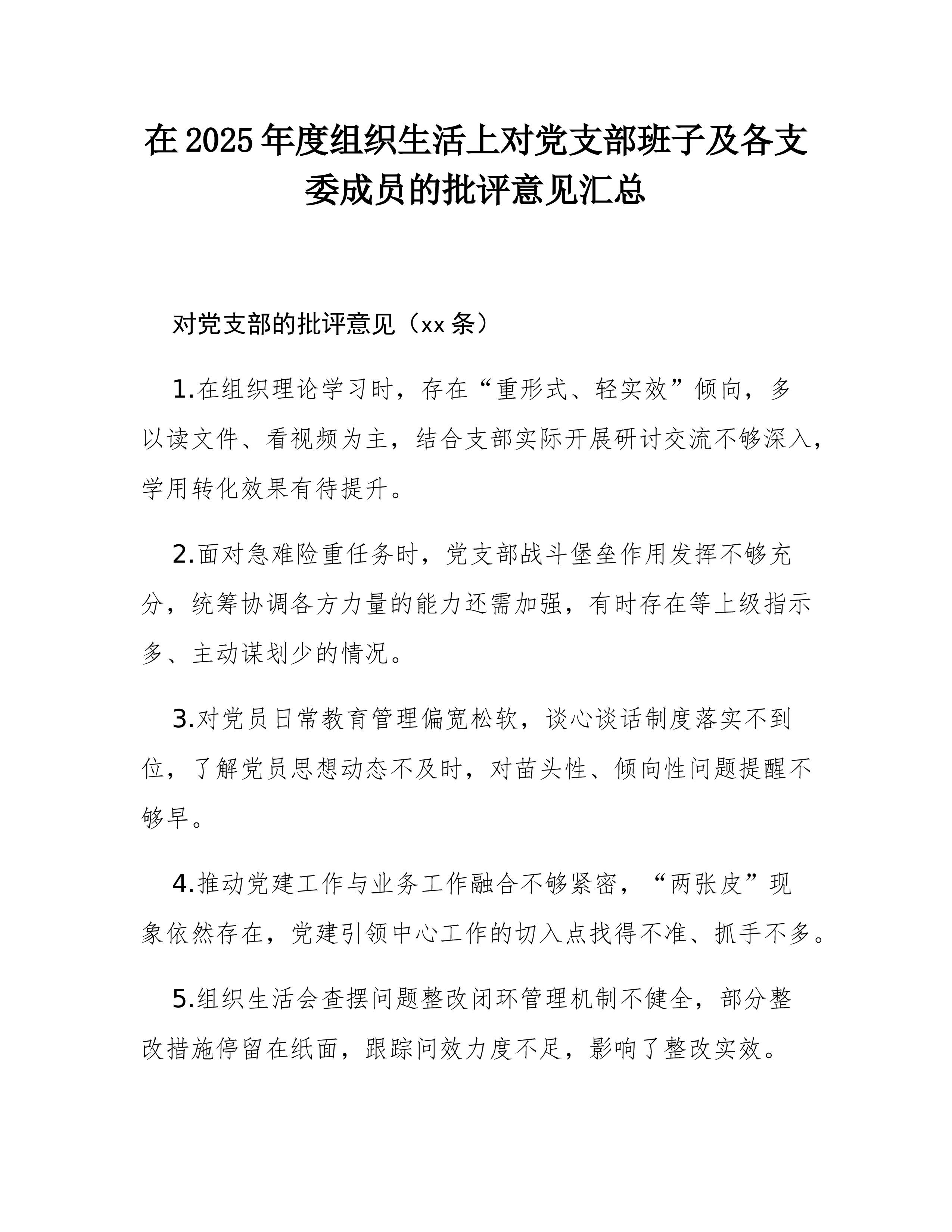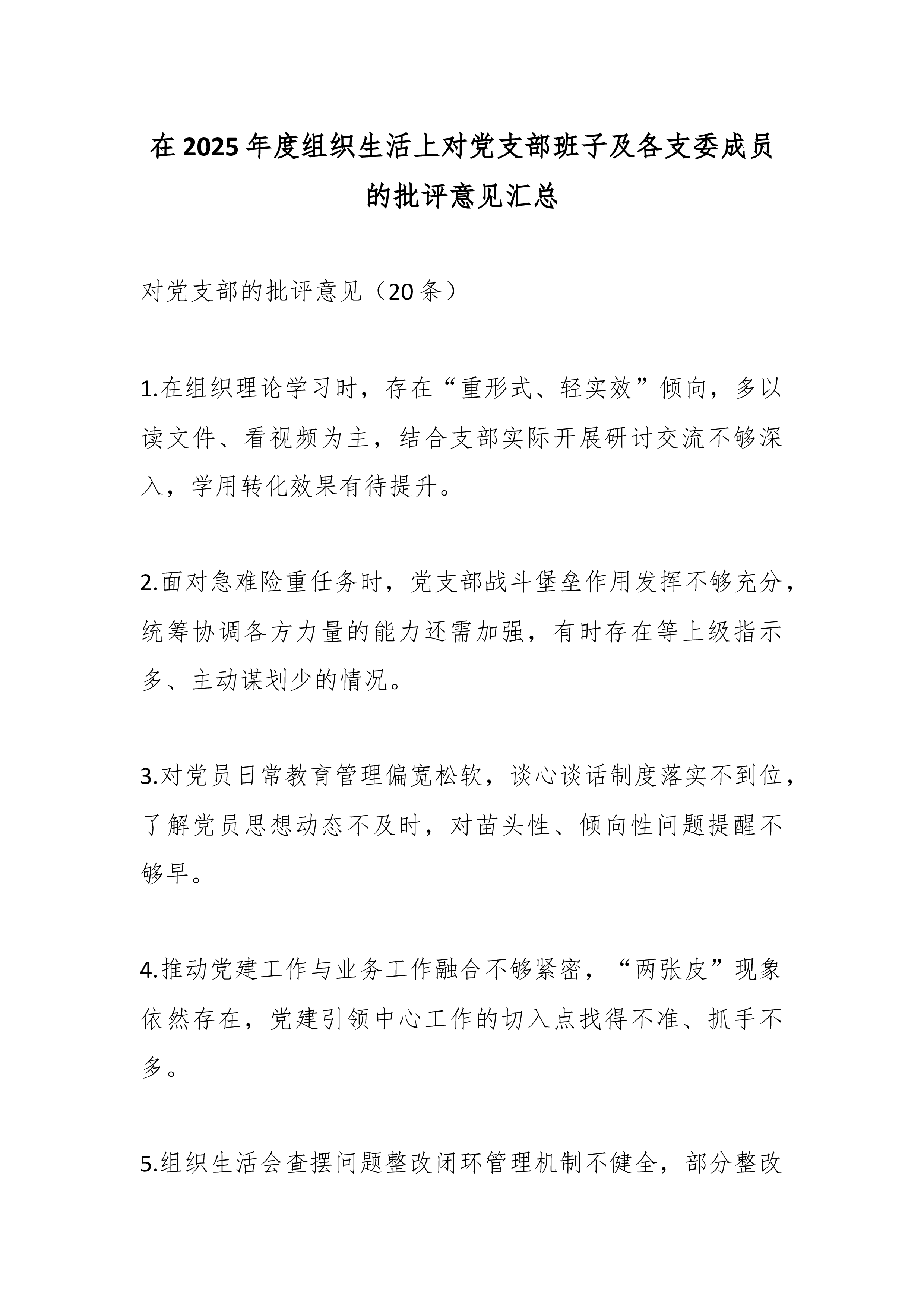 在2025年度组织生活上对党支部班子及各支委成员的批评意见汇总对党支部的批评意见(xx条)1.在组织理论学习时,存在“重形式、轻实效”倾向,多以读文件、看视频为主,结合支部实际开展研讨交流不够深入,学用转化效果有待提升。2.面对急难险重任务时,党支部战斗堡垒作用发挥不够充分,统筹协调各方力量的能力还需加强,有时存在等上级指示多、主动谋划少的情况。3.对党员日常教育管理偏宽松软,谈心谈话制度落实不到位,了解党员思想动态不及时,对苗头性、倾向性问题提醒不够早。4.推动党建工作与业务工作融合不够紧密,“两张皮”现象依然存在,党建引领中心工作的切入点找得不准、抓手不多。5.组织生活会查摆问题整改闭环管理机制不健全,部分整改措施停留在纸面,跟踪问效力度不足,影响了整改实效。6.在联系服务群众方面,主动...