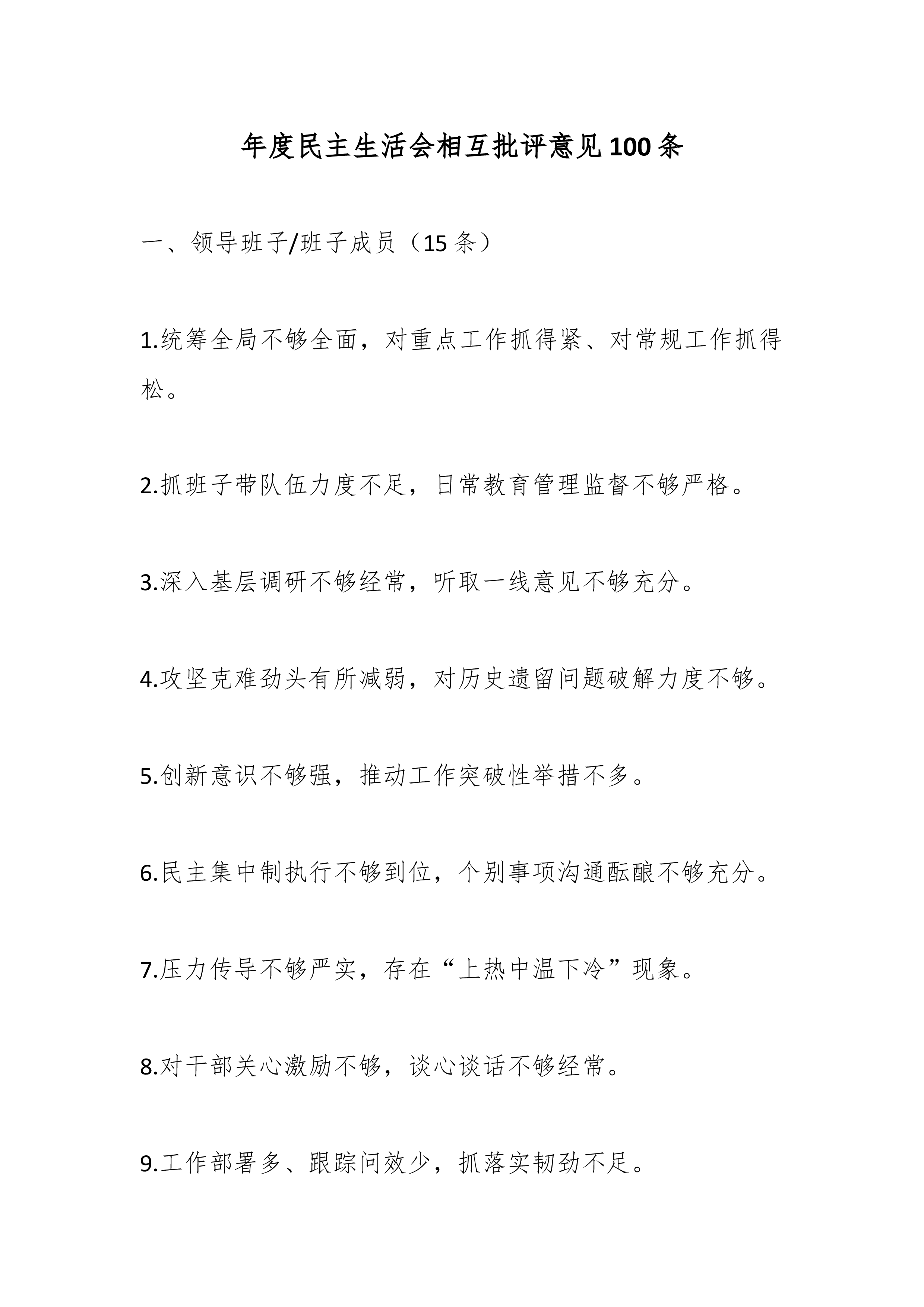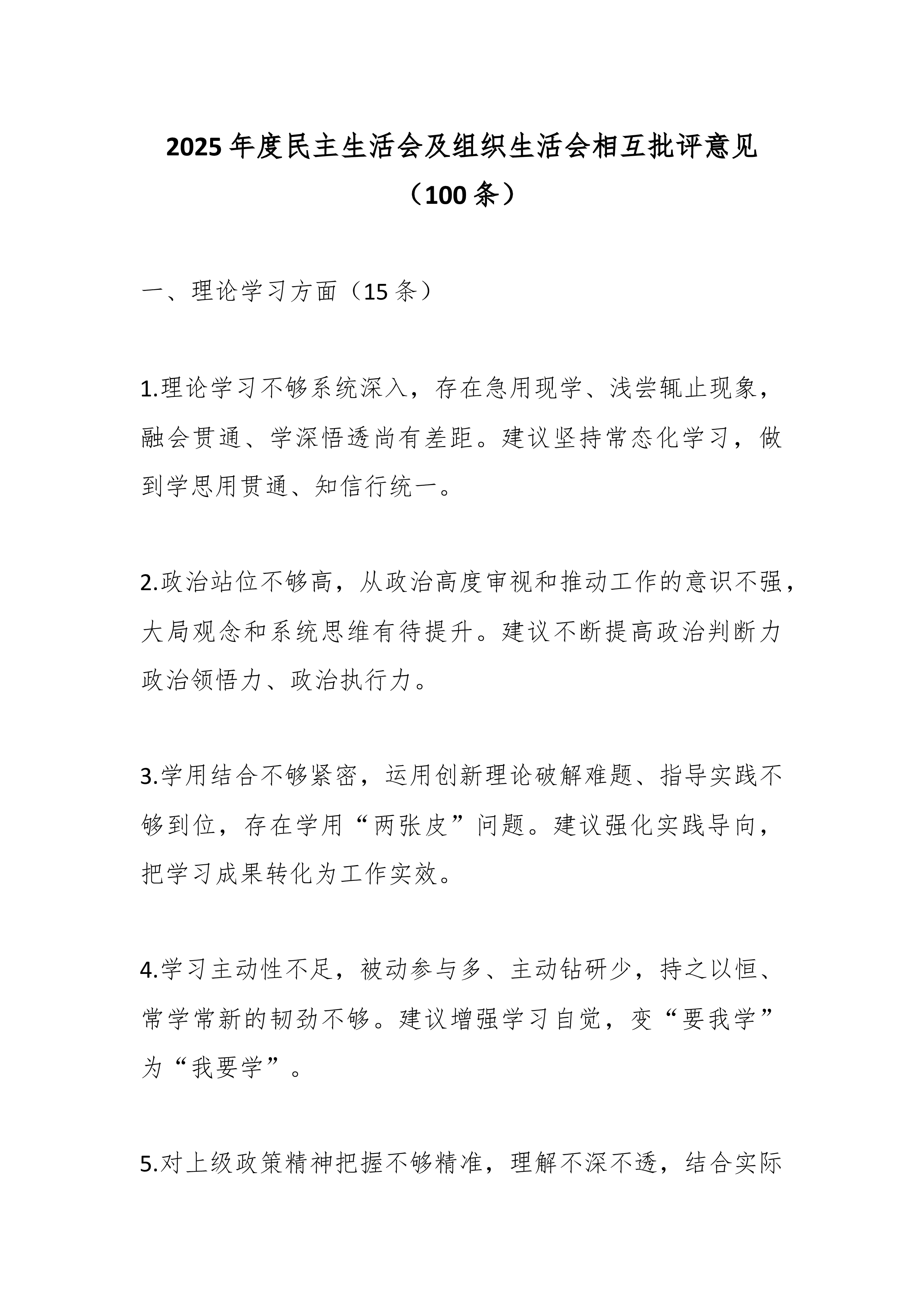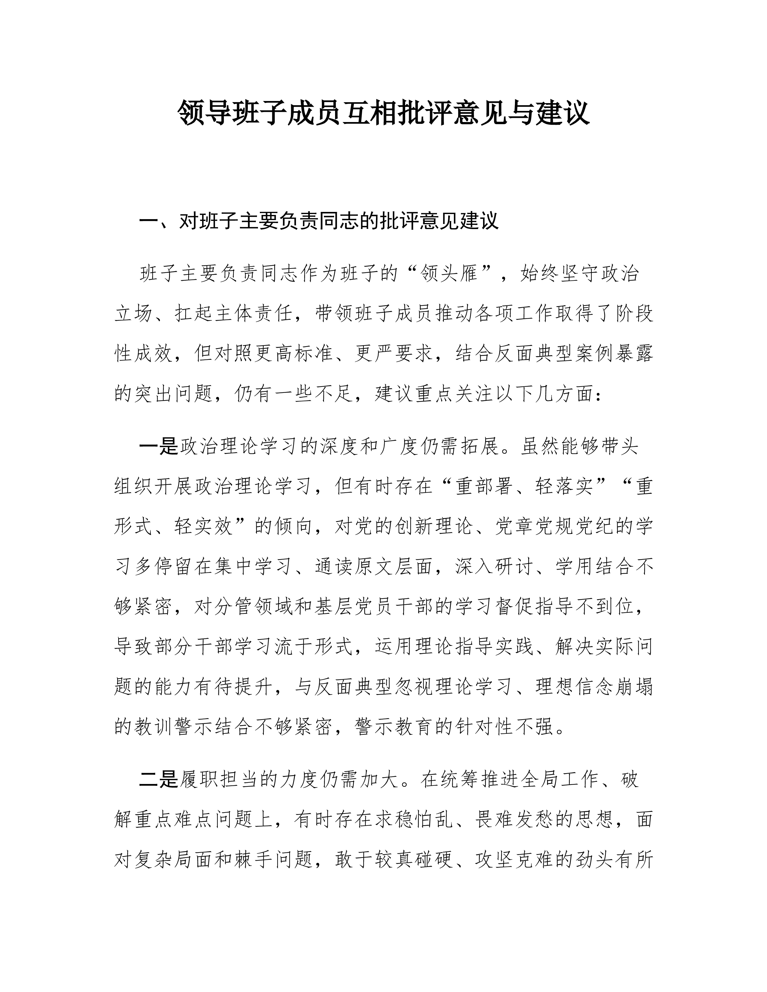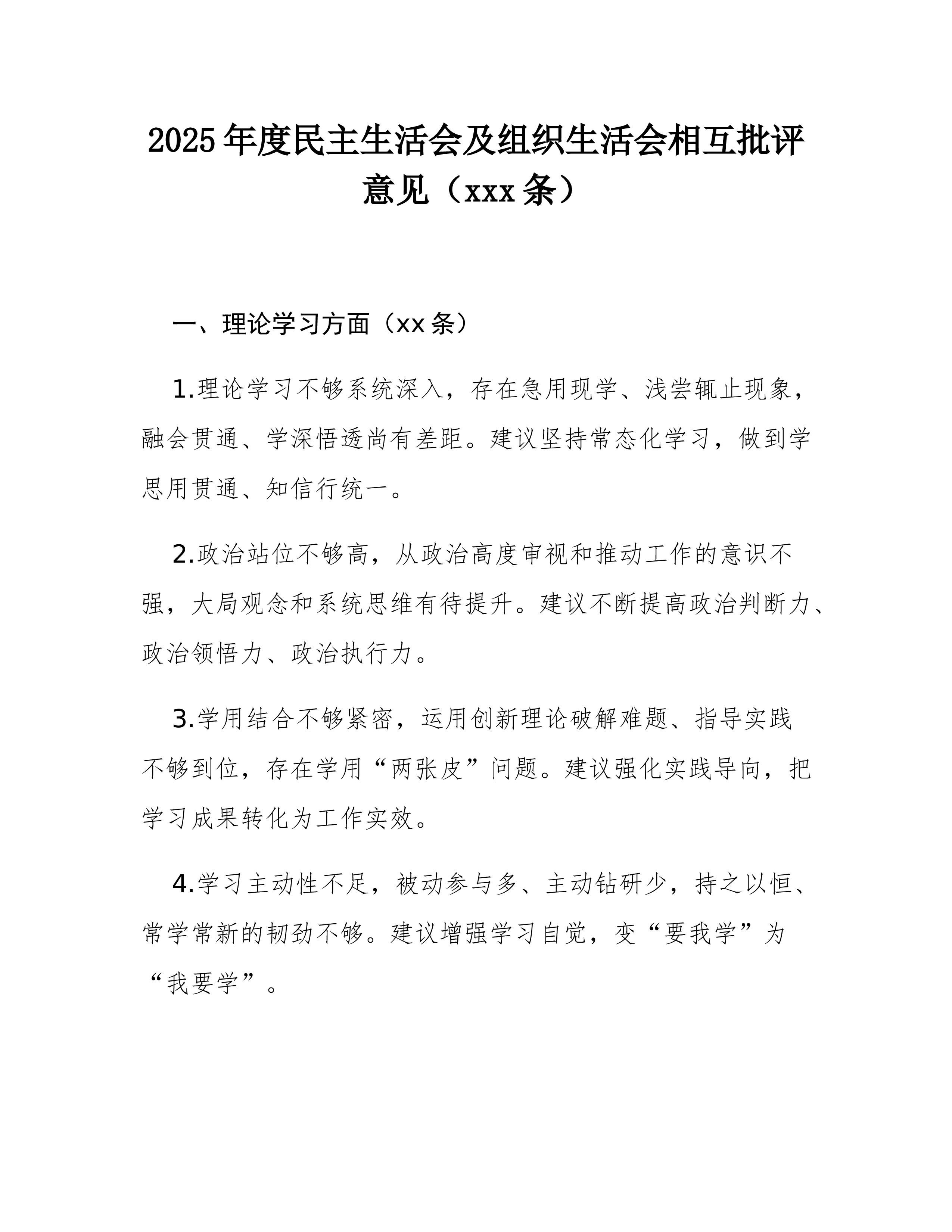 在2025年度组织生活上对党支部班子及各支委成员的批评意见汇总对党支部的批评意见(xx条)1.在组织理论学习时,存在“重形式、轻实效”倾向,多以读文件、看视频为主,结合支部实际开展研讨交流不够深入,学用转化效果有待提升。2.面对急难险重任务时,党支部战斗堡垒作用发挥不够充分,统筹协调各方力量的能力还需加强,有时存在等上级指示多、主动谋划少的情况。3.对党员日常教育管理偏宽松软,谈心谈话制度落实不到位,了解党员思想动态不及时,对苗头性、倾向性问题提醒不够早。4.推动党建工作与业务工作融合不够紧密,“两张皮”现象依然存在,党建引领中心工作的切入点找得不准、抓手不多。5.组织生活会查摆问题整改闭环管理机制不健全,部分整改措施停留在纸面,跟踪问效力度不足,影响了整改实效。6.在联系服务群众方面,主动...