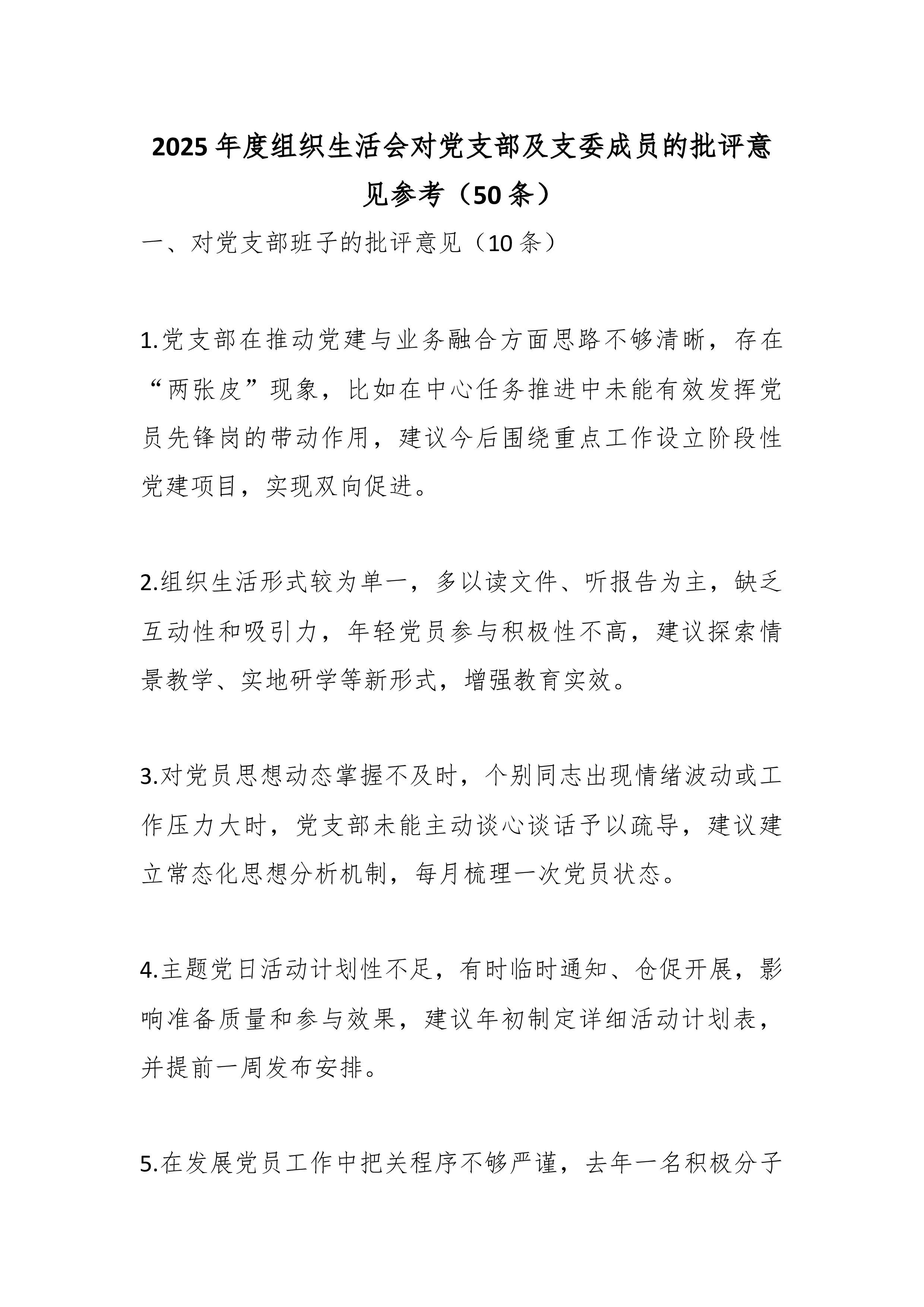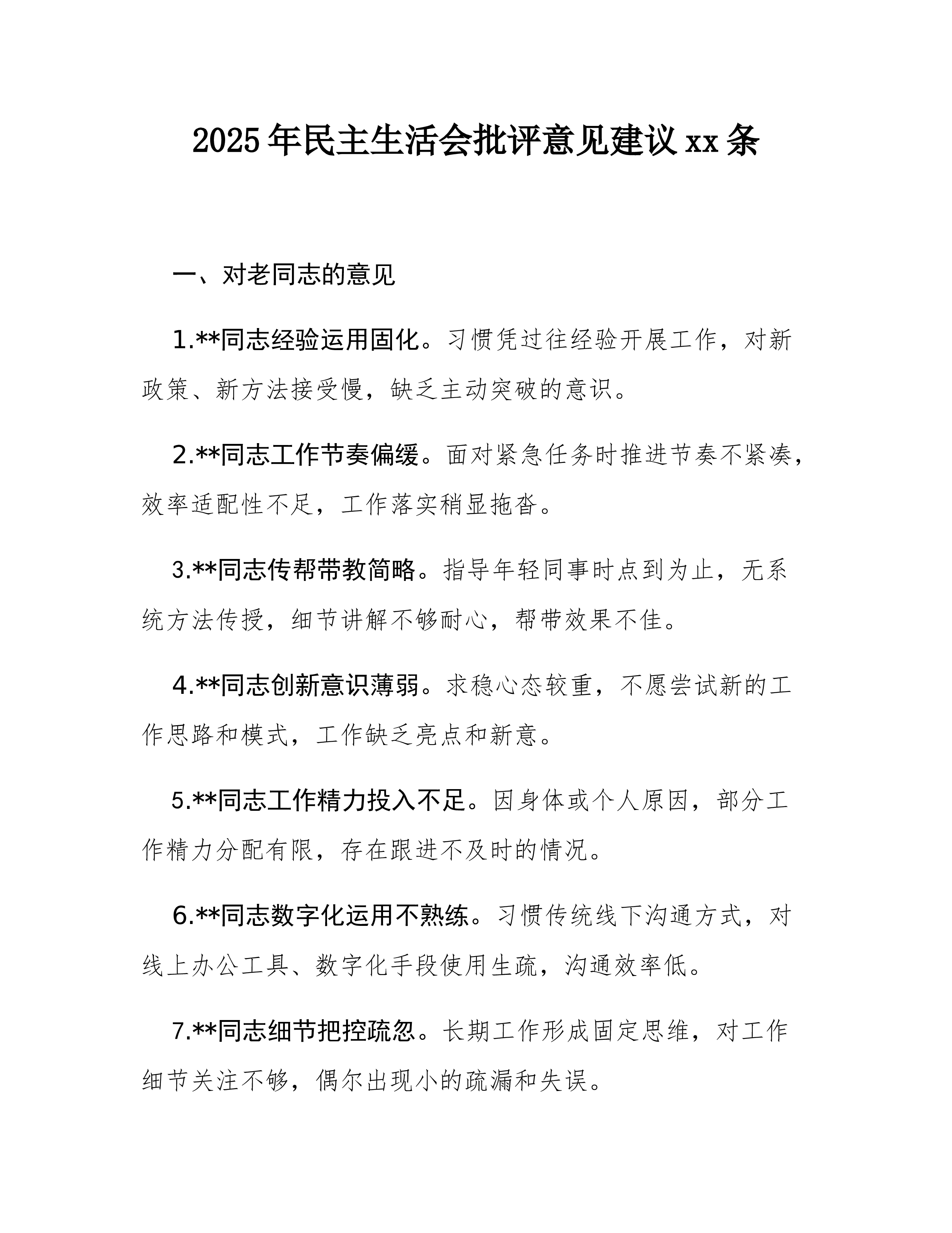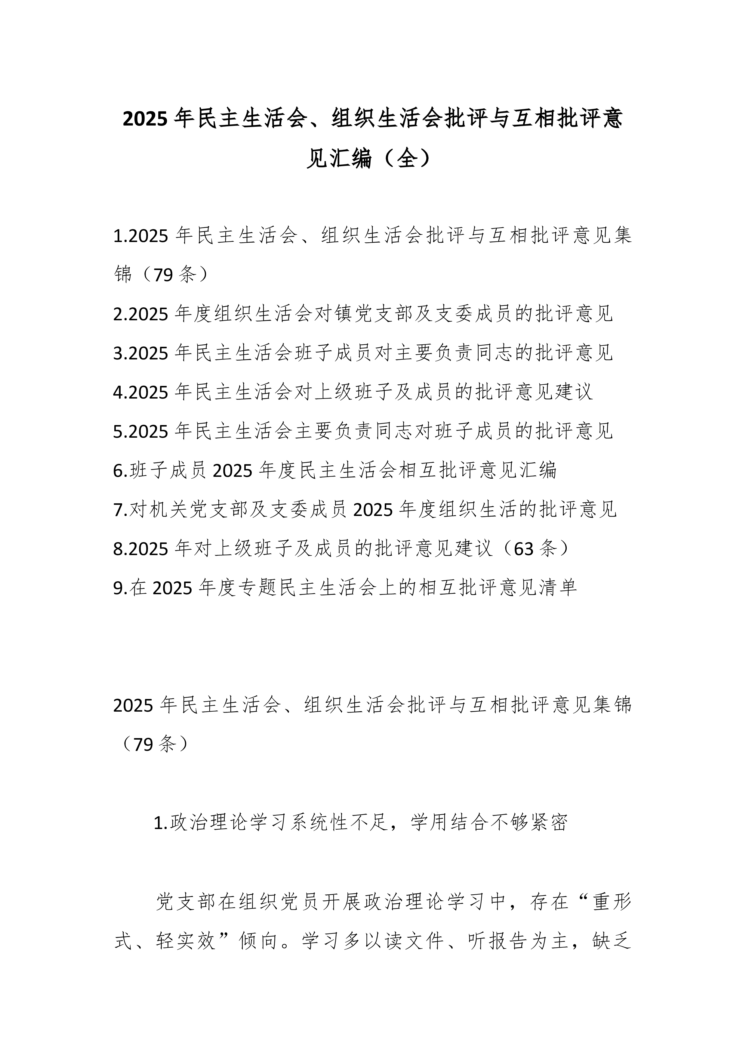 2025年民主生活会、组织生活会批评与互相批评意见汇编(全)