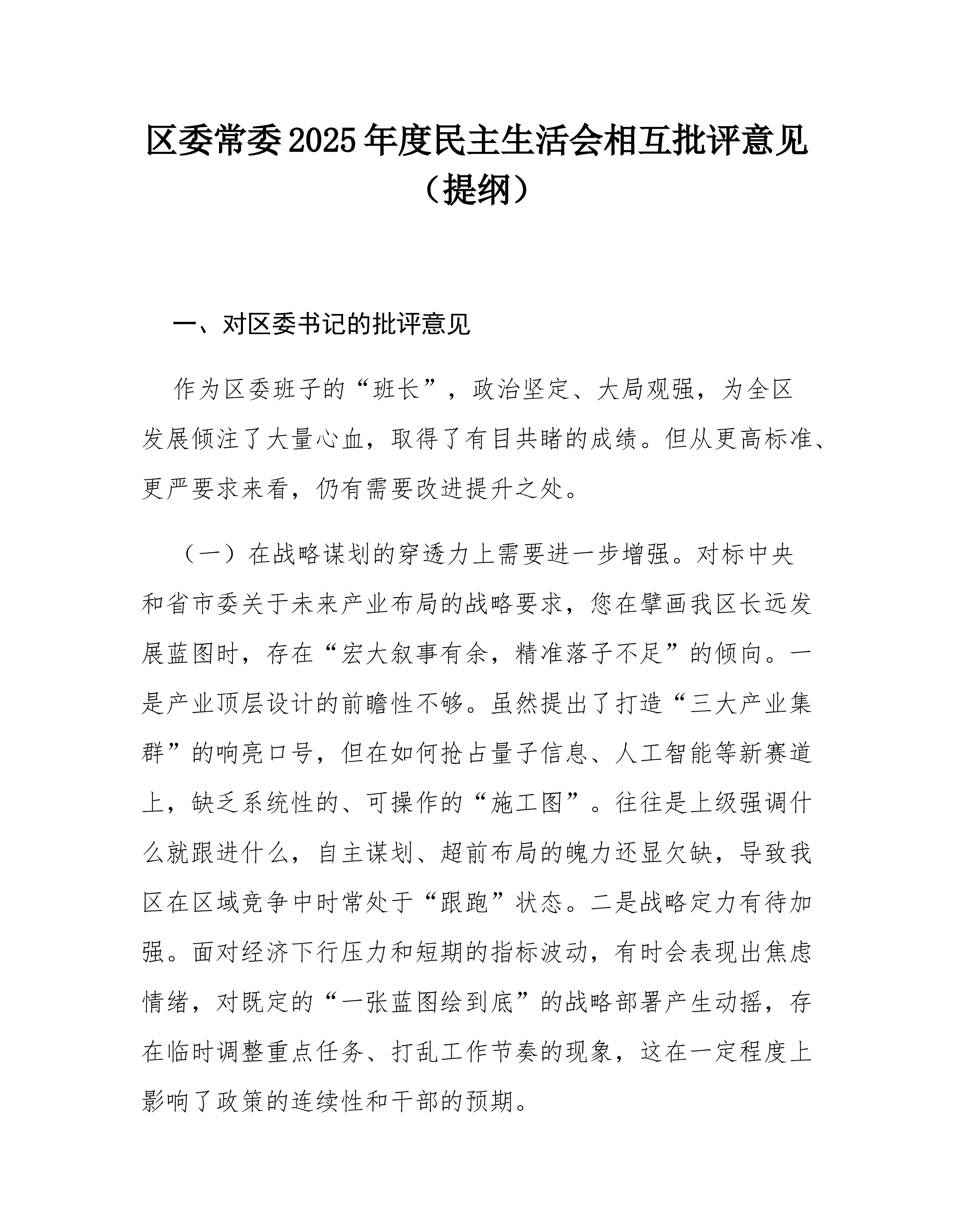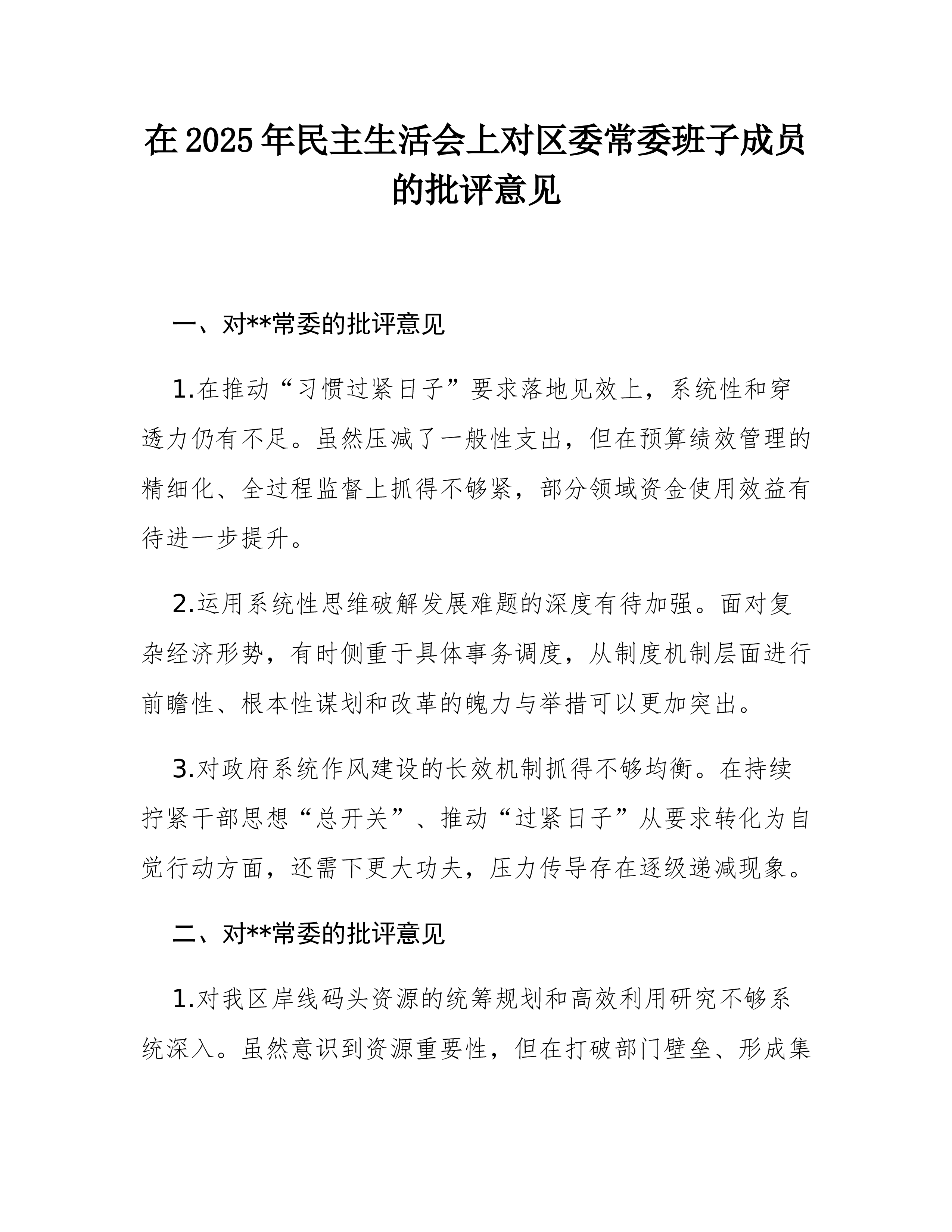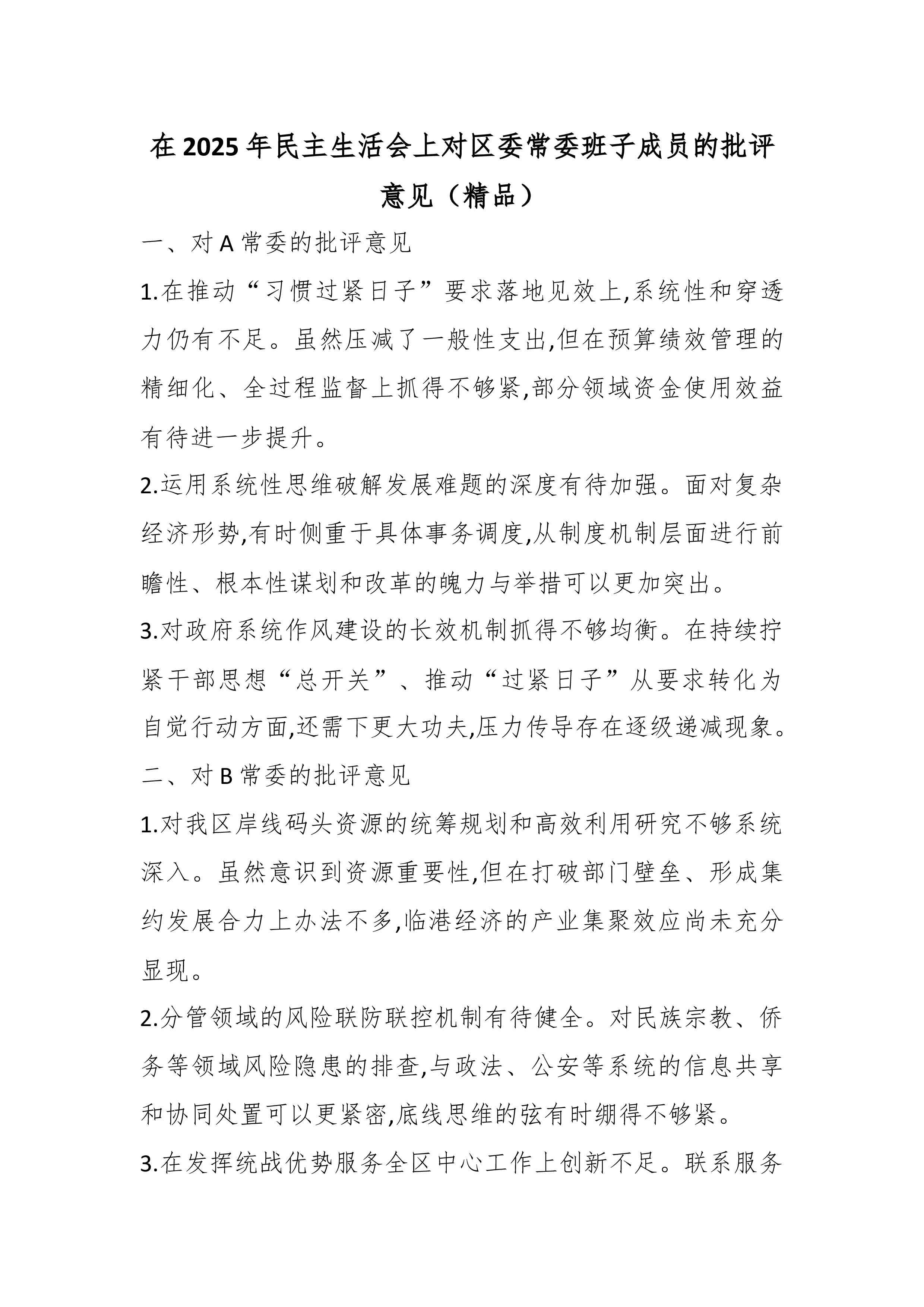在2025年民主生活会上对区委常委班子成员的批评意见(精品)一、对A常委的批评意见1.在推动“习惯过紧日子”要求落地见效上,系统性和穿透力仍有不足。虽然压减了一般性支出,但在预算绩效管理的精细化、全过程监督上抓得不够紧,部分领域资金使用效益有待进一步提升。2.运用系统性思维破解发展难题的深度有待加强。面对复杂经济形势,有时侧重于具体事务调度,从制度机制层面进行前瞻性、根本性谋划和改革的魄力与举措可以更加突出。3.对政府系统作风建设的长效机制抓得不够均衡。在持续拧紧干部思想“总开关”、推动“过紧日子”从要求转化为自觉行动方面,还需下更大功夫,压力传导存在逐级递减现象。二、对B常委的批评意见1.对我区岸线码头资源的统筹规划和高效利用研究不够系统深入。虽然意识到资源重要性,但在打破部门壁垒、形成集...