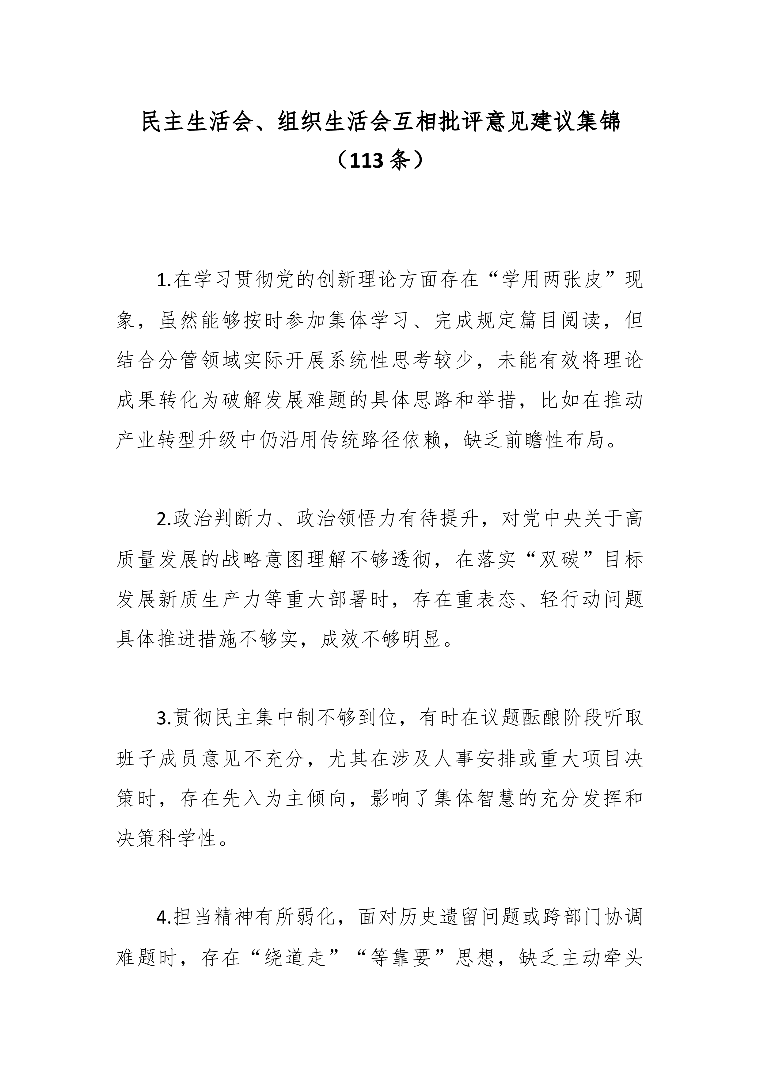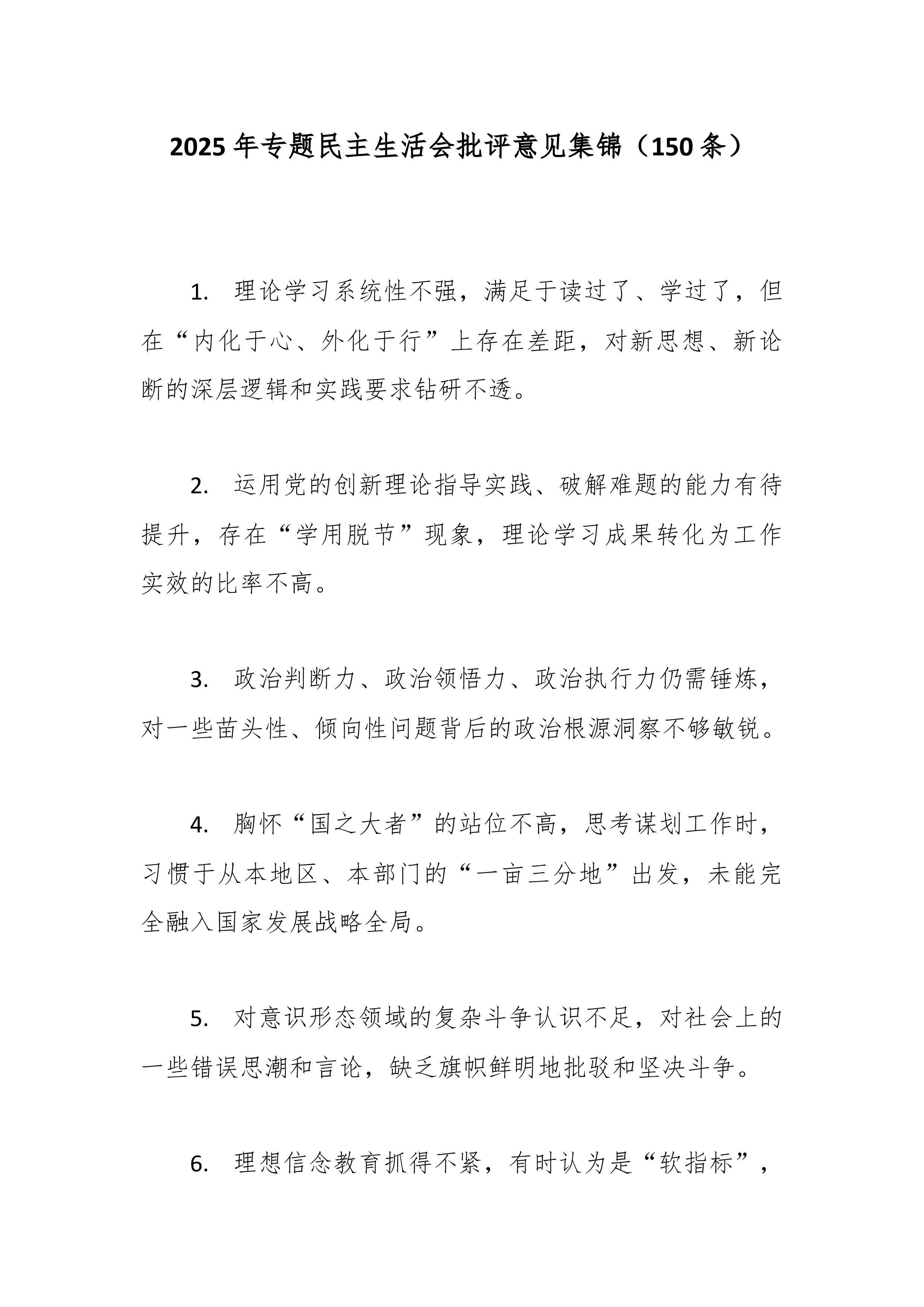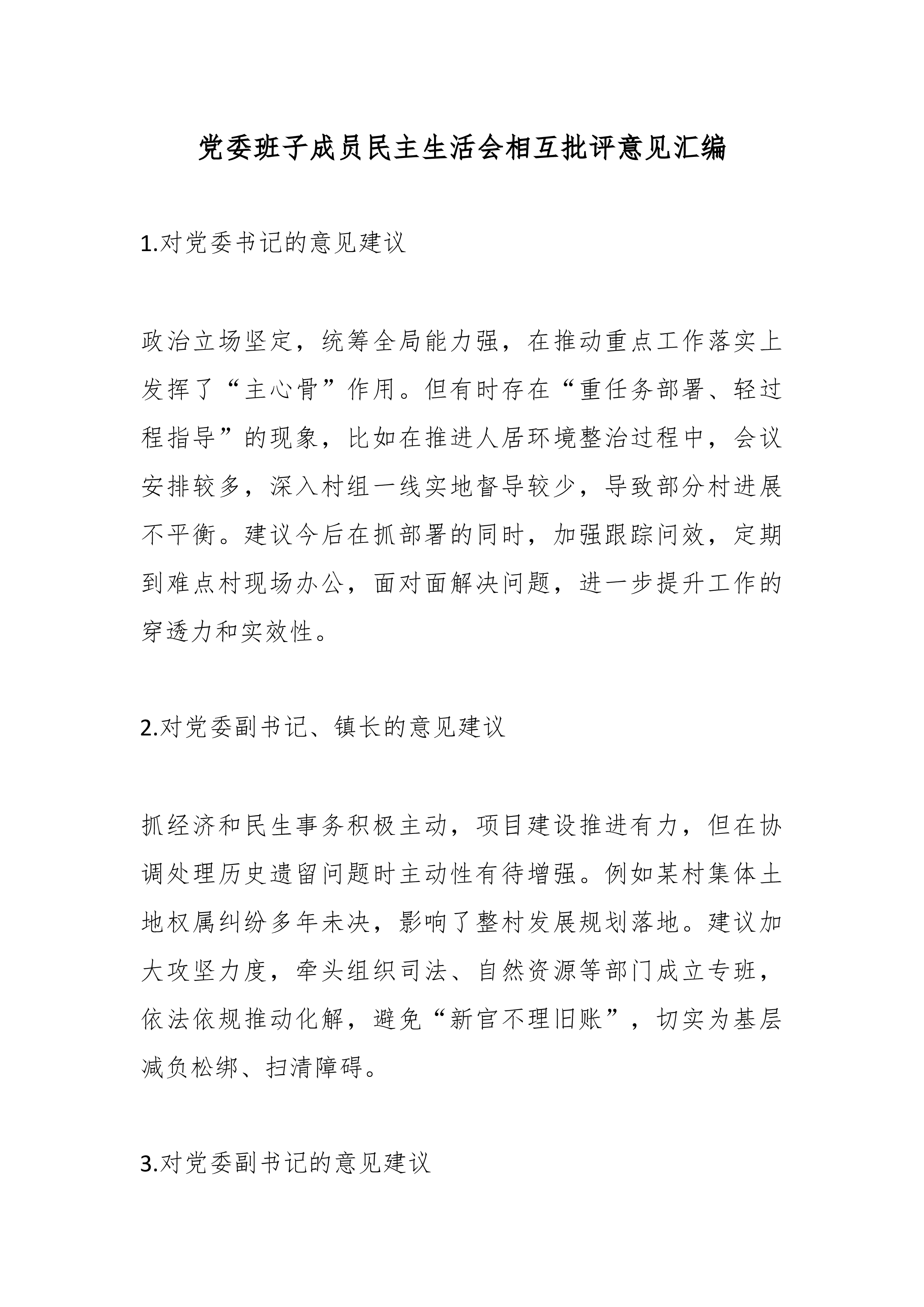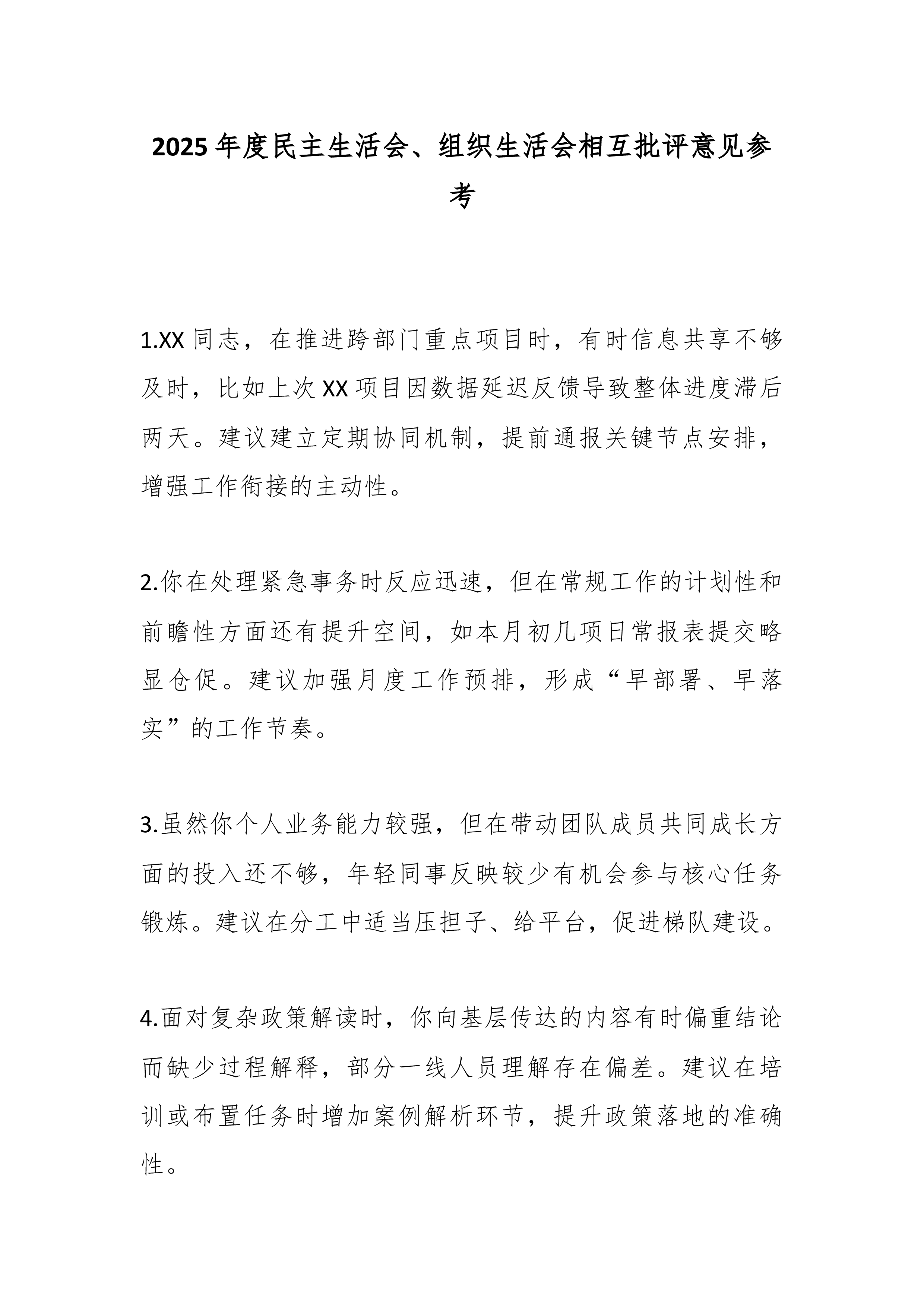 在2025年民主生活会上对区委常委班子成员的批评意见(精品)一、对A常委的批评意见1.在推动“习惯过紧日子”要求落地见效上,系统性和穿透力仍有不足。虽然压减了一般性支出,但在预算绩效管理的精细化、全过程监督上抓得不够紧,部分领域资金使用效益有待进一步提升。2.运用系统性思维破解发展难题的深度有待加强。面对复杂经济形势,有时侧重于具体事务调度,从制度机制层面进行前瞻性、根本性谋划和改革的魄力与举措可以更加突出。3.对政府系统作风建设的长效机制抓得不够均衡。在持续拧紧干部思想“总开关”、推动“过紧日子”从要求转化为自觉行动方面,还需下更大功夫,压力传导存在逐级递减现象。二、对B常委的批评意见1.对我区岸线码头资源的统筹规划和高效利用研究不够系统深入。虽然意识到资源重要性,但在打破部门壁垒、形成集...