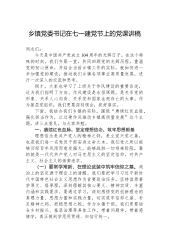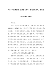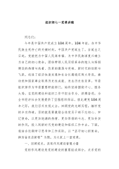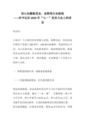 初心如磐跟党走,奋楫笃行启新程——村书记在2025年“七一”党员大会上的讲话同志们:大家好!今天我们怀着崇敬与喜悦,相聚在此,共同庆祝中国共产党成立104周年。104载风雨兼程,党始终初心不改,为人民谋幸福,为民族谋复兴。值此特殊时刻,我谨代表xx村党支部,向全体党员致以诚挚问候与崇高敬意!下面,我从过往工作、现存挑战、未来规划三个方面与大家深入交流。一、硕果盈枝展风华,砥砺奋进谱新篇(一)党建领航强堡垒,红色基因焕生机理论武装铸魂。常态化组织党员学习习近平新时代中国特色社会主义思想,通过“三会一课”、专题讲座、线上学习平台等,累计开展学习活动xx次,参与党员xx人次,切实提升党员政治素养,让党的创新理论在基层落地生根。队伍建设赋能。注重党员发展,吸收xx名年轻有为、积极上进的优秀青年入党,...