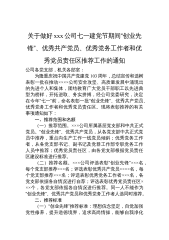 关于做好xxx公司七一建党节期间“创业先锋”、优秀共产党员、优秀党务工作者和优秀党员责任区推荐工作的通知