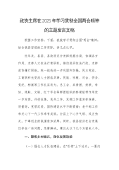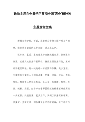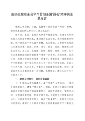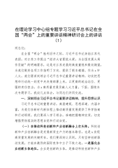 在理论学习中心组专题学习习近平总书记在全国“两会”上的重要讲话精神研讨会上的讲话(1)同志们:在全国“两会”胜利召开之际,习近平总书记亲临江苏代表团,对江苏工作提出“经济大省要挑大梁,为全国发展大局作贡献”的明确要求,这是对江苏发展的高度重视和殷切期望,为我们做好各项工作指明了方向、提供了根本遵循。作为x市人大,我们要深刻领会习近平总书记重要讲话精神,切实把思想和行动统一到党中央决策部署上来,以更高的政治站位、更强的责任担当,为x高质量发展贡献人大力量。下面,围绕本次专题学习,我谈几点体会,与同志们共同交流。一、深刻领会习近平总书记重要讲话精神,提升思想认识习近平总书记的重要讲话,高屋建瓴、思...