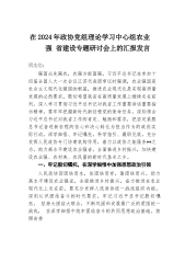 在2024年政协党组理论学习中心组农业强省建设专题研讨会上的汇报发言同志们:强国必先强农,农强方能国强。习近平总书记在参加十四届全国人大一次会议江苏代表团审议时强调,农业强国是社会主义现代化强国的根基,推进农业现代化是实现高质量发展的必然要求,殷切希望我省在高质量发展上继续走在前列。深入学习贯彻习近平总书记对我省工作重要讲话重要指示精神,要牢牢把握新时代新征程党的使命任务,深刻领会习近平总书记对我省工作的肯定、勉励和要求,把坚定紧跟总书记奋进新征程的信心和决心转化为担当作为的政协实际行动,深学细悟、牢记嘱托,科学指引、履职见效,充分发挥人民政协专门协商机构作用,着力以政协之能服务**之为,助力...