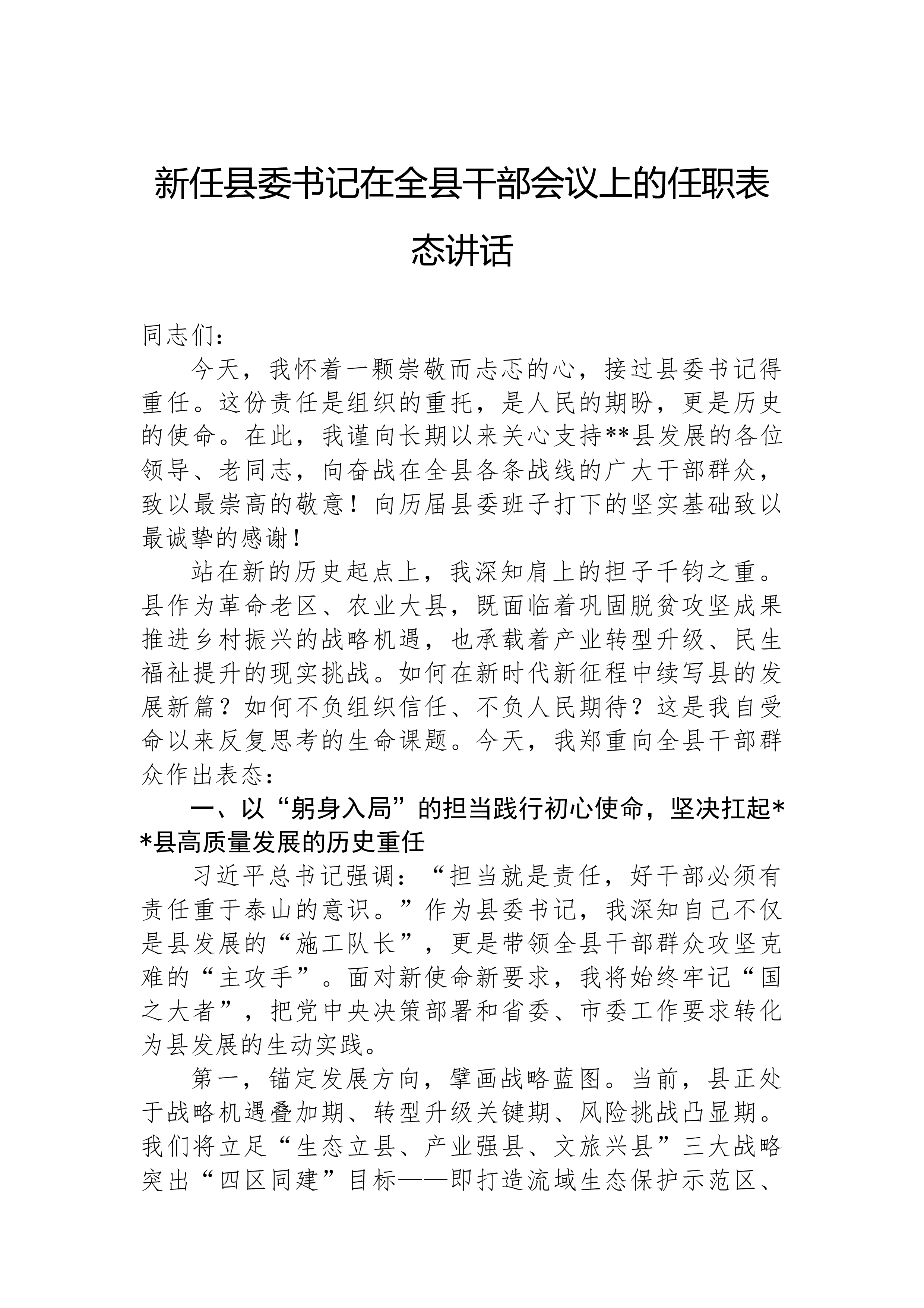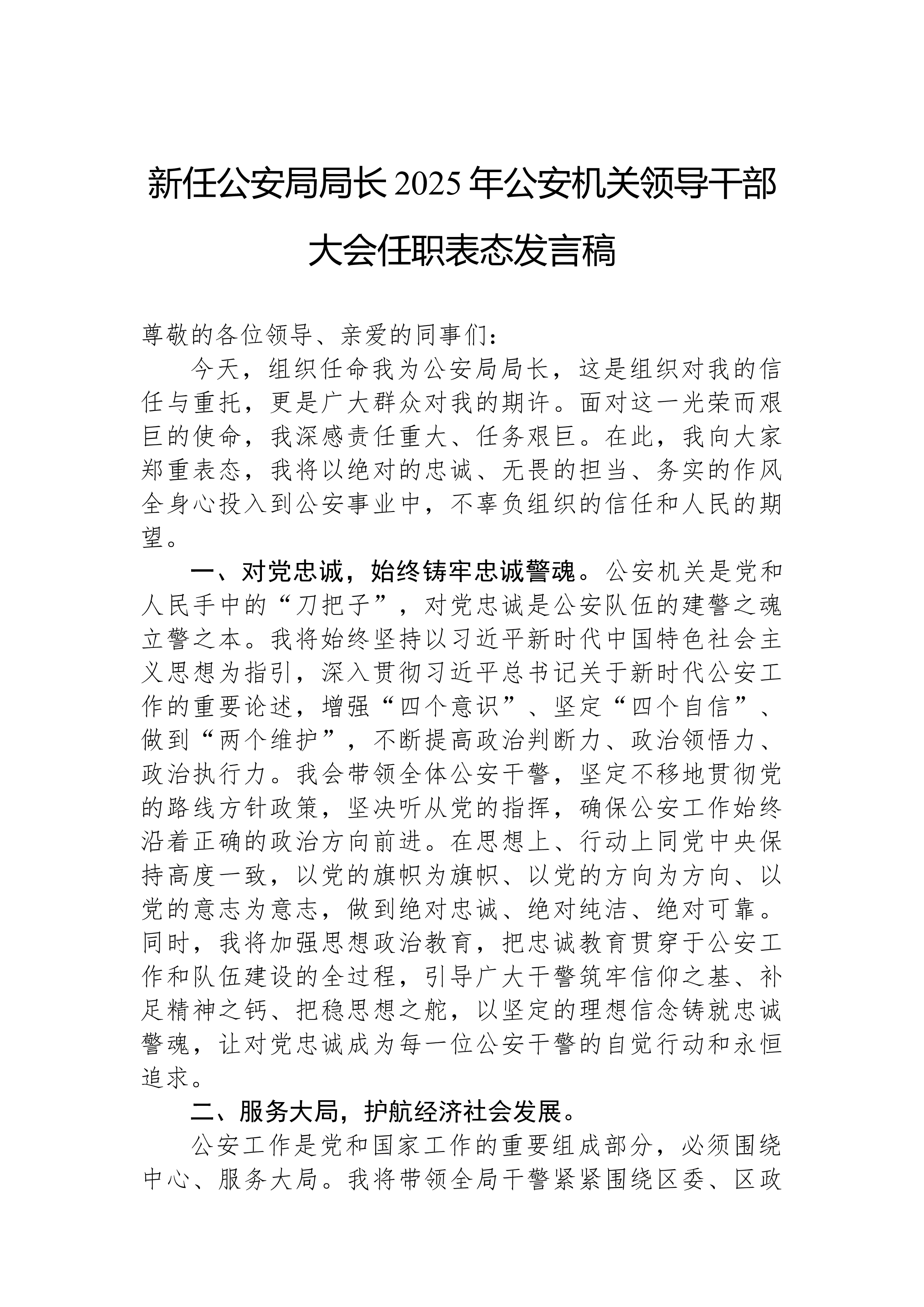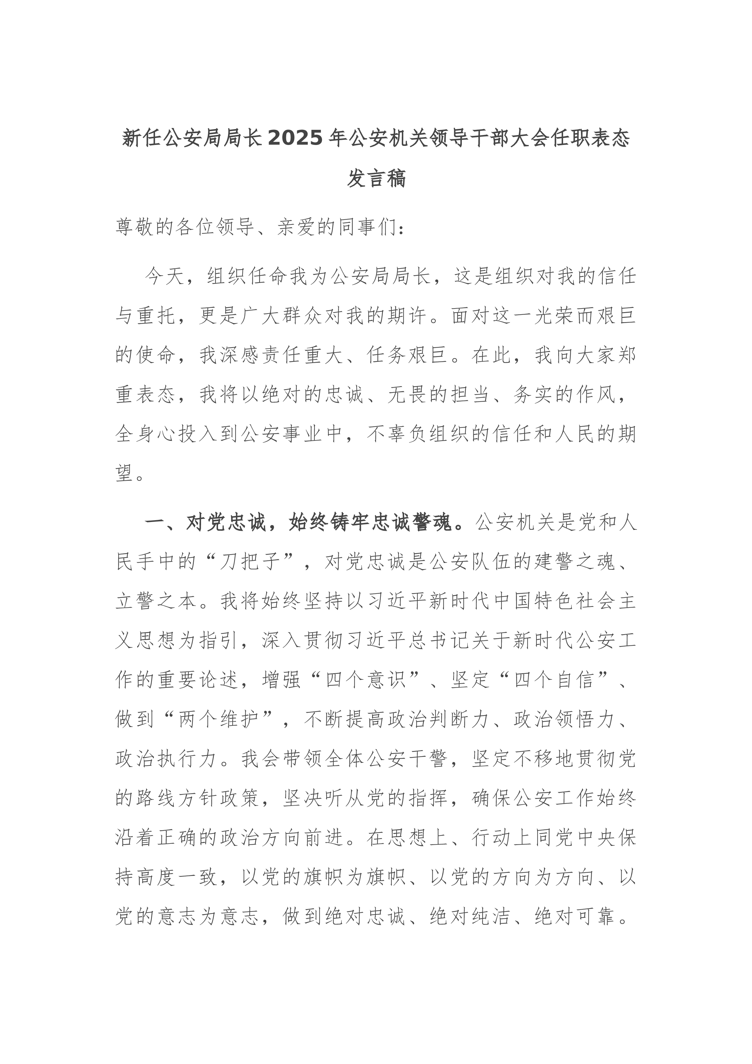 新任公安局局长2025年公安机关领导干部大会任职表态发言稿尊敬的各位领导、亲爱的同事们:今天,组织任命我为公安局局长,这是组织对我的信任与重托,更是广大群众对我的期许。面对这一光荣而艰巨的使命,我深感责任重大、任务艰巨。在此,我向大家郑重表态,我将以绝对的忠诚、无畏的担当、务实的作风,全身心投入到公安事业中,不辜负组织的信任和人民的期望。一、对党忠诚,始终铸牢忠诚警魂。公安机关是党和人民手中的“刀把子”,对党忠诚是公安队伍的建警之魂、立警之本。我将始终坚持以习近平新时代中国特色社会主义思想为指引,深入贯彻习近平总书记关于新时代公安工作的重要论述,增强“四个意识”、坚定“四个自信”、做到“两个维护”,不断提高政治判断力、政治领悟力、政治执行力。我会带领全体公安干警,坚定不移地贯彻党的路线方针政...