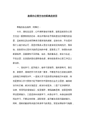 政府办公室主任任职表态发言 尊敬的各位领导、同事们: 今天,我站在这里,心中满怀激动与敬畏,接受县政府办公室主任这一重要职务的任命,请允许我向给予我高度信任和重托的县委、县政府以及全体同事表示最深切的感谢。这份任命,不仅是对我个人能力的认可,更是对我肩上责任与使命的沉甸甸托付。我深知,县政府办公室作为政府运转的中枢,是联系上下、协调左右的桥梁纽带,其重要性不言而喻。在此,我郑重表态,将全力以赴,不负众望,以高度的责任感和使命感,推动县政府办公室工作迈上新台阶。 一、强化学习,提升能力,做学习型领导。面对新时代、新任务、新要求,我将把学习作为第一要务,不断提升自己的政治素养、业务能力和领导...