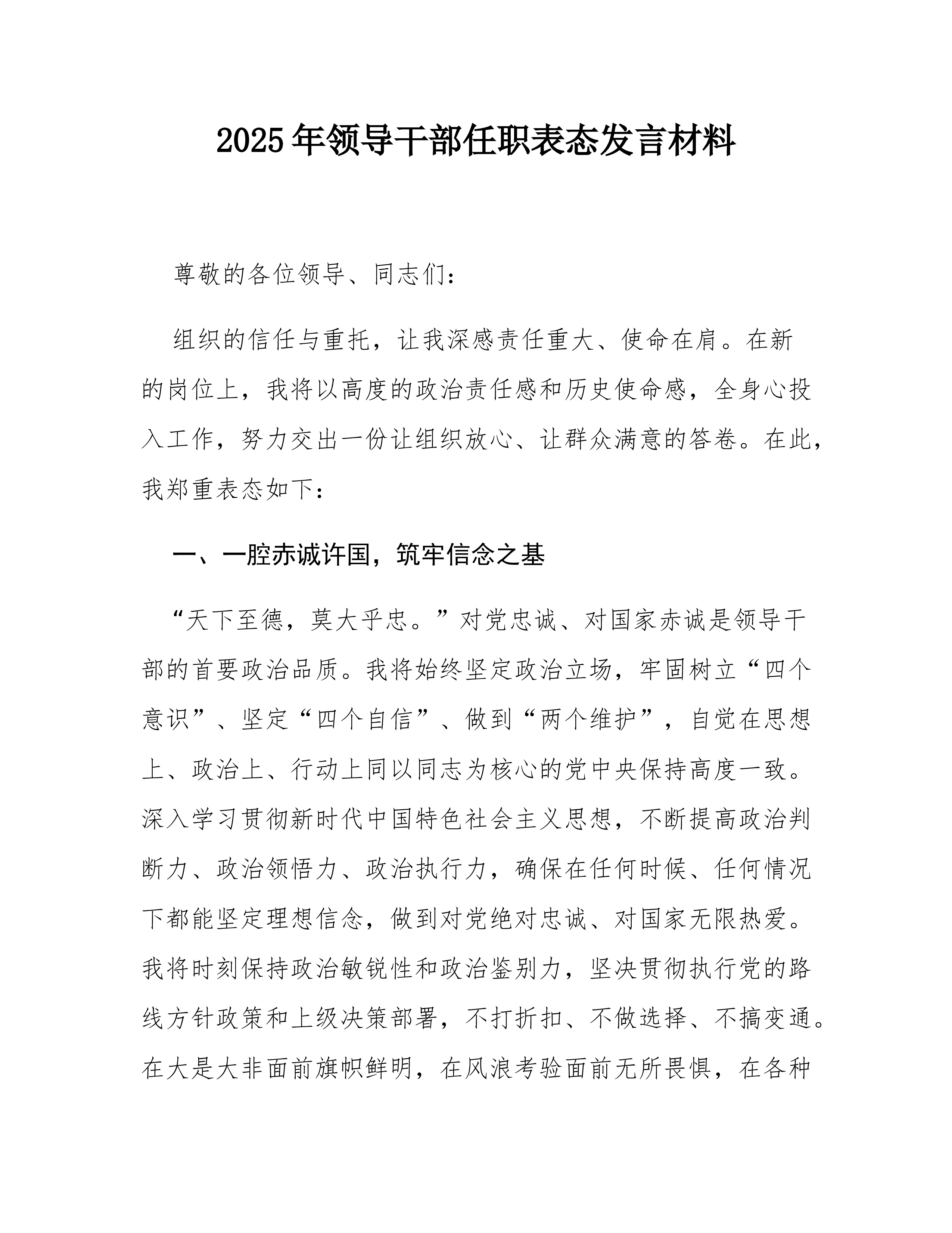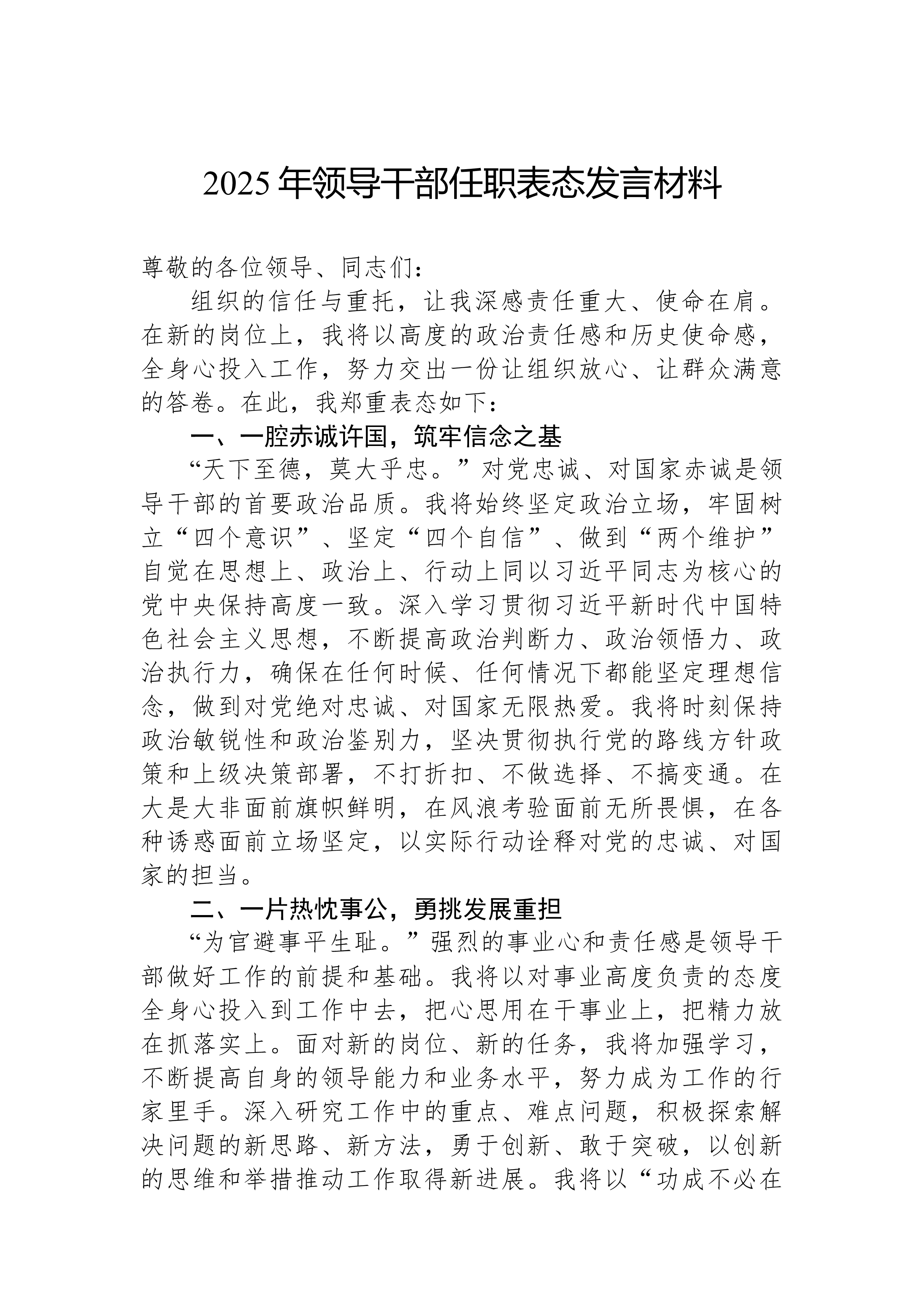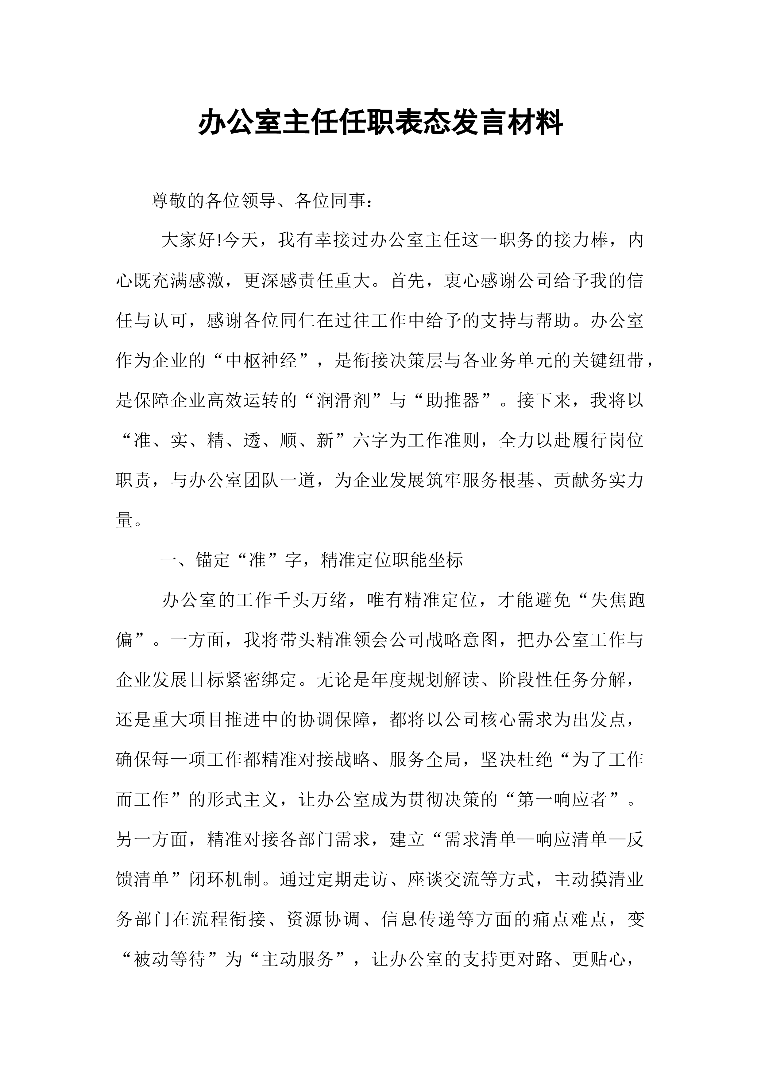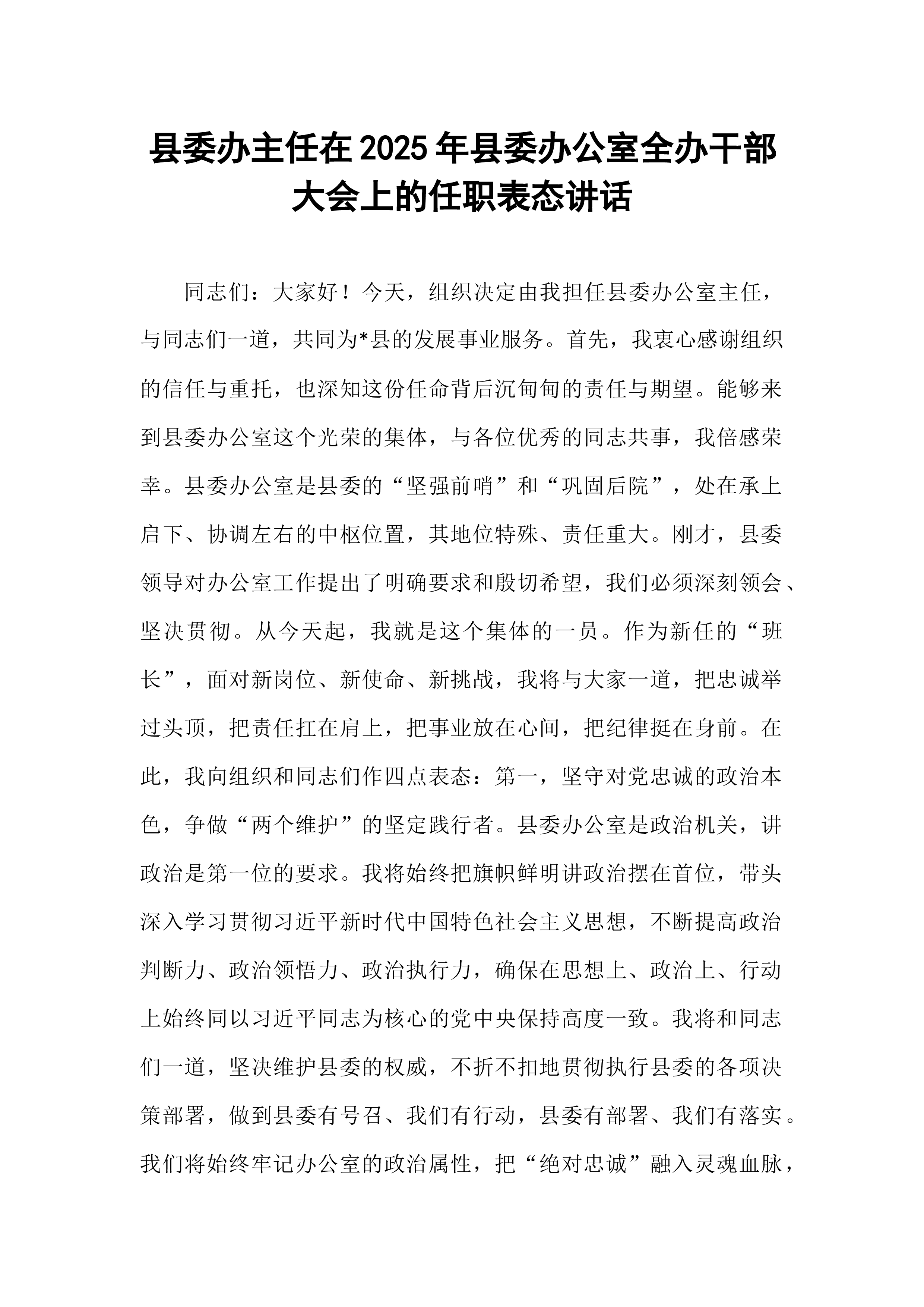 县委办主任在2025年县委办公室全办干部大会上的任职表态讲话同志们:大家好!今天,组织决定由我担任县委办公室主任,与同志们一道,共同为*县的发展事业服务。首先,我衷心感谢组织的信任与重托,也深知这份任命背后沉甸甸的责任与期望。能够来到县委办公室这个光荣的集体,与各位优秀的同志共事,我倍感荣幸。县委办公室是县委的“坚强前哨”和“巩固后院”,处在承上启下、协调左右的中枢位置,其地位特殊、责任重大。刚才,县委领导对办公室工作提出了明确要求和殷切希望,我们必须深刻领会、坚决贯彻。从今天起,我就是这个集体的一员。作为新任的“班长”,面对新岗位、新使命、新挑战,我将与大家一道,把忠诚举过头顶,把责任扛在肩上,把事业放在心间,把纪律挺在身前。在此,我向组织和同志们作四点表态:第一,坚守对党忠诚的政治本色,...