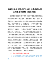 政府机关党支部书记2021年度组织生活会检查发言材料(四个对照)按照县委组织部《关于召开2021年度基层党组织组织生活会和开展民主评议党员工作的通知》要求,会前,我重温学习了习近平总书记在党史学习教育动员会上的重要讲话、习近平总书记“七一”重要讲话、《中共中央关于党的百年奋斗重大成就和历史经验的决议》等重要文件精神,深入学习了《党章》《中国共产党组织工作条例》等党内法规条例。在此基础上,广泛征询听取机关党支部委员、工作和服务对象以及身边党员同事的意见建议,严格对照党中央和习近平总书记的号召和要求,对照新时代合格党员标准,对照入党誓词,对照革命先辈和先进典型,紧密联系实际进行党性分析,认真查摆自...