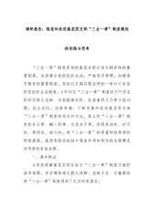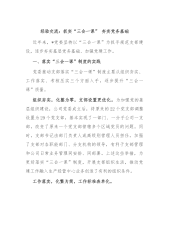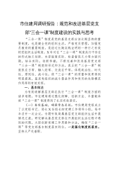 市住建局调研报告:规范和改进基层党支部“三会一课”制度建设的实践与思考“三会一课”制度是党的基层支部应该长期坚持的重要制度,也是健全党的组织生活,严格党员管理,加强党员教育的重要制度,是经过长期实践证明的一种行之有效的党组织生活制度。X针对在“三会一课”制度执行中存在的形式缺乏创新、内容脱离实际、检查督促乏力等方面问题,结合实际,创新举措,不断完善和改进基层党支部“三会一课”制度的形式和方法,真正把“三会一课”制度抓在日常、融入经常、交流在平常,体现政治性、时代性、原则性、战斗性,使“三会一课”的质量和效果得到明显提高,基层党组织的战斗堡垒作用和党员的先锋模范作用得到有效发挥。一、基本做法为有...