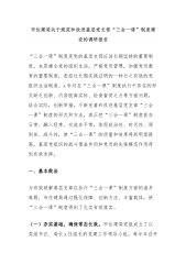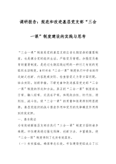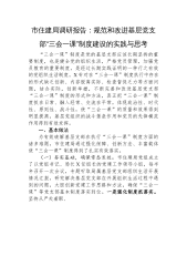 市住建局调研报告规范和改进基层党支部“三会一课”制度建设的实践与思考“三会一课”制度是党的基层支部应该长期坚持的重要制度,也是健全党的组织生活,严格党员管理,加强党员教育的重要制度,是经过长期实践证明的一种行之有效的党组织生活制度。X针对在“三会一课”制度执行中存在的形式缺乏创新、内容脱离实际、检查督促乏力等方面问题,结合实际,创新举措,不断完善和改进基层党支部“三会一课”制度的形式和方法,真正把“三会一课”制度抓在日常、融入经常、交流在平常,体现政治性、时代性、原则性、战斗性,使“三会一课”的质量和效果得到明显提高,基层党组织的战斗堡垒作用和党员的先锋模范作用得到有效发挥。一、基本做法为有效...