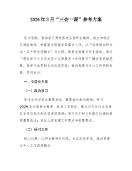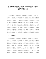 某市纪委监委机关党委2026年度“三会一课”工作计划(精品)为深入学习贯彻习近平新时代中国特色社会主义思想、党的二十大及二十届三中、四中全会精神,全面落实新时代党的建设总要求,进一步提升市纪委监委机关党建工作规范化、科学化水平,根据上级党组织党建工作部署,结合纪检监察工作实际,制定本计划。本计划核心目标是强化党的基层组织建设,锤炼纪检监察干部政治素养,推动党建各项工作落地见效,以高度的政治责任感和坚定的制度执行力,严格落实“三会一课”制度,为锻造忠诚干净担当的纪检监察铁军提供坚强组织保障。一、总体要求坚持以习近平新时代中国特色社会主义思想为指导,深入贯彻党的二十大和二十届历次全会精神,全面落实新时代党的建设总要求和新时代党的组织路线,以党的政治建设为统领,以提升组织力为重点,突出政治功能、强...