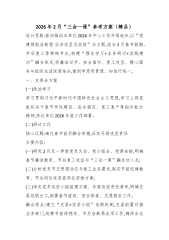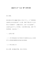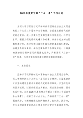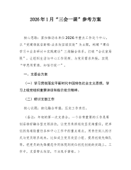 2026年2月“三会一课”参考方案(精品)设计思路:紧扣推动本单位2026年中心工作开局起步,以“党建领航启新程·业务攻坚见实效”为主题,结合2月春节假期、节后复工等特殊节点,构建“理论学习+业务研讨+实践建功”融合体系,将廉洁过节、安全值守、复工攻坚、暖心服务与组织生活深度结合,做到学思用贯通、知信行统一。一、支委会方案(一)政治学习学习贯彻习近平新时代中国特色社会主义思想,学习上级党组织关于春节作风建设、安全稳定、复工复产等指示批示精神,传达单位2026年度工作部署。(二)研讨工作核心议题:细化春节前后融合举措,压实开局攻坚责任主要内容:(一)研究2月及一季度党员大会、党小组会、党课安排,明确春节廉洁教育、节后复工攻坚与“三会一课”融合切入点;(二)分析党员节日思想动态与复工业务需求,制...