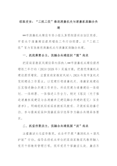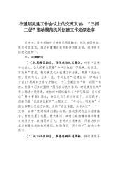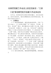 在基层党建工作会议上的交流发言:“三抓三促”推动模范机关创建工作走深走实近年来,局党组始终坚持抓思想促融合、抓队伍促担当、抓作风促落实,推动创建模范机关取得积极成效,现将有关经验交流如下。一、主要做法(一)抓思想促融合,强化政治机关意识。对标“让党中央放心、让人民群众满意”和“讲政治、守纪律、负责任、有效率”要求,制定模范机关创建工作方案,聚焦“政治过硬、党建有力、业务一流、作风良好”创建目标,明确4个方面12项具体任务有序推进。中心党委坚持“第一议题”制度,党委书记多次围绕“强化政治机关意识,建设模范机关”等主题讲专题党课,连续四年组织编印《“学习强国好书荐读”荐书寄语》读本,推动党员干部以...