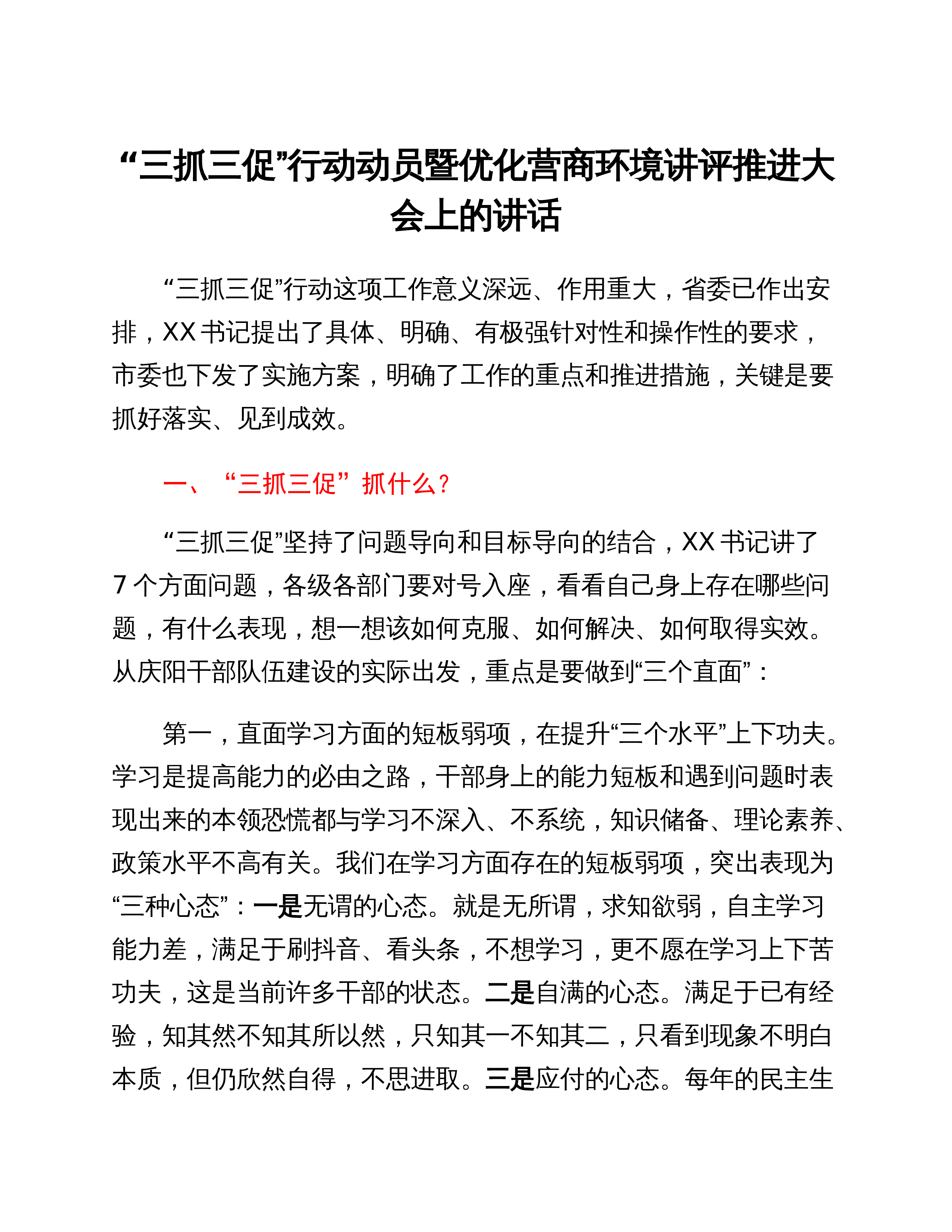 “三抓三促”行动动员暨优化营商环境讲评推进大会上的讲话“三抓三促”行动这项工作意义深远、作用重大,省委已作出安排,XX书记提出了具体、明确、有极强针对性和操作性的要求,市委也下发了实施方案,明确了工作的重点和推进措施,关键是要抓好落实、见到成效。一、“三抓三促”抓什么?“三抓三促”坚持了问题导向和目标导向的结合,XX书记讲了7个方面问题,各级各部门要对号入座,看看自己身上存在哪些问题,有什么表现,想一想该如何克服、如何解决、如何取得实效。从庆阳干部队伍建设的实际出发,重点是要做到“三个直面”:第一,直面学习方面的短板弱项,在提升“三个水平”上下功夫。学习是提高能力的必由之路,干部身上的能力短板...