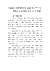 XX县公共资源交易中心2023年上半年扫黑除恶工作总结及下半年工作计划一、上半年工作总结今年以来,为深入学习贯彻习近平总书记关于常态化开展扫黑除恶斗争的重要指示精神,认真贯彻落实上级扫黑除恶专项斗争部署,XXX县公共资源交易中心以反有组织犯罪法实施一周年为契机,常态化机制化推进扫黑除恶斗争向纵深发展,进一步营造风清气正的公共资源交易环境,助推法治XX建设。一是加强组织领导,提高政治站位。结合工作实际,调整优化XXX县公共资源交易中心常态化开展扫黑除恶斗争工作领导小组。中心主要负责人作为第一责任人,亲自部署安排常态化扫黑除恶工作,通过抓领导班子队伍建设,分管领导分管科室负责人,科室负责人传达到科...