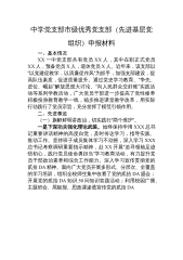 XX中学党支部市级优秀党支部(先进基层党组织)申报材料一、基本情况XX一中党支部共有党员XX人,其中在职正式党员XX人,预备党员X人,退休党员X人。近年来,该支部以“以党建促教学,以清廉促作风”为抓手,加强支部建设,提高队伍素质,促进质量提升。通过党史学习教育、“争先、进位、崛起”解放思想大讨论“向人民群众交好账”实践活动等系列学教活动,广大党员干部进一步提高了党性修养,积极投身教育教学一线,稳步推进课堂教学改革,用实际行动践行了党员宗旨,充分发挥了模范引领作用二、先进事迹(一)旗帜鲜明讲政治,切实践行“两个维护”。一是下深功夫强化理论武装。始终保持学用总书记重要讲话精神的高度自觉,及时传达学...