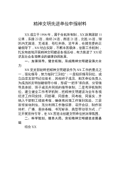 精神文明先进单位申报材料XX成立于1996年,属于全民所有制,XX距离团部11公里,东接23连,南邻24连,西连21连,北抵16连,辖区内无国道、无省道、有红井路。近年来,在团党委的正确领导下,XX结合实际,不断丰富载体,创新工作机制,扎实有效地开展精神文明建设各项活动,有力推进了XX经济及社会各项事业的健康协调发展。一、加强领导,健全机制,形成精神文明建设强大合力XX党支部始终把精神文明建设作为XX工作的重点之一,强化领导,努力做到“三到位”:一是组织领导到位。成立由党支部书记任组长,其他班子成员、相关单位负责人为成员的文明创建领导小组,形成“一把手”亲自抓、分管领导具体抓、班子成员共同抓的...