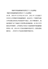 维修车间机械维修班优秀员工个人先进事迹维修车间机械维修班优秀员工个人先进事迹XX男,2010年6月毕业XX大学,2011年3月就职于XXXXX公司维修车间机械维修班。起先作为一个刚刚毕业的大学生通过活性炭公司创造的学习机会,自己不断地努力,熟练的掌握了全厂设备的工作原理以及维修技能。在2012年年底经过车间推荐,公司领导认可担任了设备维修车间机械维修班班长一职。2014年3月担任维修车间技术员(主要负责机械专业),2018年3月起担任维修车间副主任。作为技术人员2017年积极响应公司的号召,努力完成公司各项任务。在前半年的检修任务中周密安排工作,认真部署,克服了人员少,任务重等多项困难,确保了...
