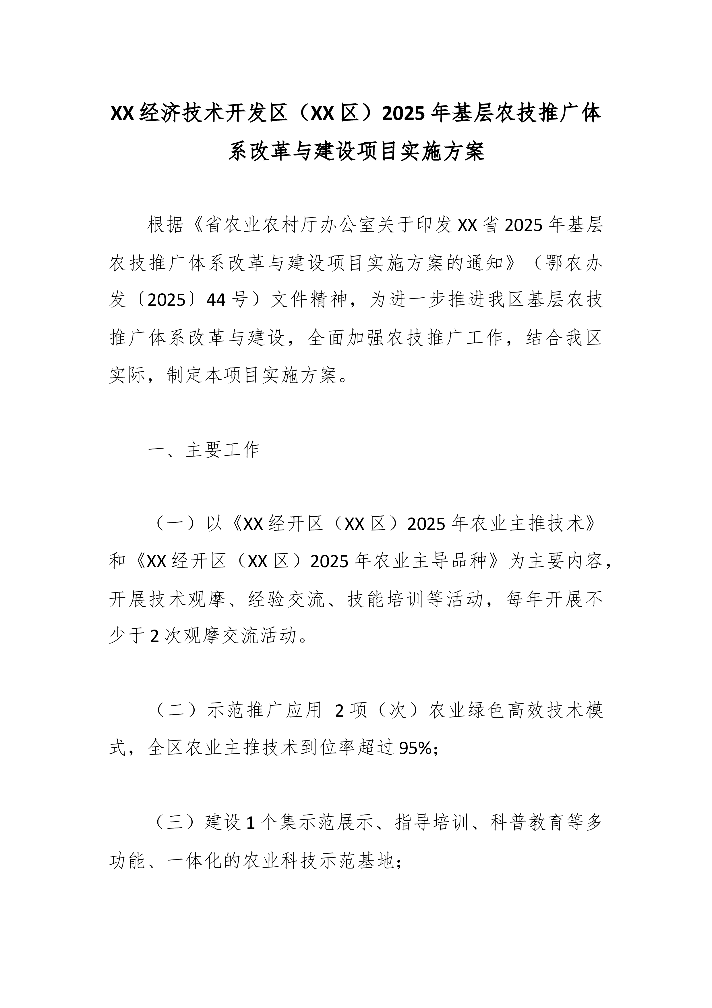 XX经济技术开发区(XX区)2025年基层农技推广体系改革与建设项目实施方案 根据《省农业农村厅办公室关于印发XX省2025年基层农技推广体系改革与建设项目实施方案的通知》(鄂农办发〔2025〕44号)文件精神,为进一步推进我区基层农技推广体系改革与建设,全面加强农技推广工作,结合我区实际,制定本项目实施方案。 一、主要工作 (一)以《XX经开区(XX区)2025年农业主推技术》和《XX经开区(XX区)2025年农业主导品种》为主要内容,开展技术观摩、经验交流、技能培训等活动,每年开展不少于2次观摩交流活动。 (二)示范推广应用 2项(次)农业绿色高效技术模式,全区农业主推技术到位率超过95%; (三)建设1个集示范展示、指导培训、科普教育等多功能、一体化的农业科技示范基地; ...