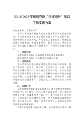 XX乡2025年基层党建“创绩提升”项目工作实施方案各村党支部、乡属各单位:为深入贯彻落实新时代党的建设总要求和党的组织路线,切实改进当前我乡基层党的建设工作中存在的问题,发挥党建引领示范作用,补足短板、增强长处,构建基层党建工作新格局,根据县委要求,经充分认证,现结合实际,制定XX乡2025年“创绩提升”行动项目实施方案如下。一、项目名称攻薄促弱类项目:加强村级党组织基层基础建设提质增效类项目:乡级服务阵地提升工程二、目标要求突出党委书记带头抓党建的鲜明导向和良好氛围,围绕“督支部、抓党员、提作风、促发展”这一主线,发挥书记在党建引领中心工作上的示范引领作用,在全乡范围内形成齐抓共管的工作合力,切实解决当前工作存在的重难点问题,对攻薄促弱类项目扎实整改、改造升级,对提质增效类项目强基固本、...