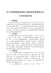 关于开展困难家庭残疾儿童机构托养服务试点工作的实施方案一、指导思想以xx思想为指导,深入贯彻落实习近平总书记关于儿童工作重要指示批示和考察xx重要讲话精神,紧紧围绕困难家庭残疾儿童托养服务需求,进一步健全困难家庭残疾儿童托养服务体系,完善托养服务全链条制度和工作标准,畅通儿童福利同社会救助、医疗保障、康复救助、教育保障等制度的衔接渠道,健全完善残疾童福利政策。二、工作目标在保障机构内孤弃儿童日常抚育前提下,通过“日托”“周托”“月托”等方式,为困难家庭残疾儿童提供“养、治、教、康”、社工和心理健康等服务,为困难家庭提供“喘息服务”。发挥儿童福利机构养育、康复等专业优势,开展困难残疾儿童家庭支持...