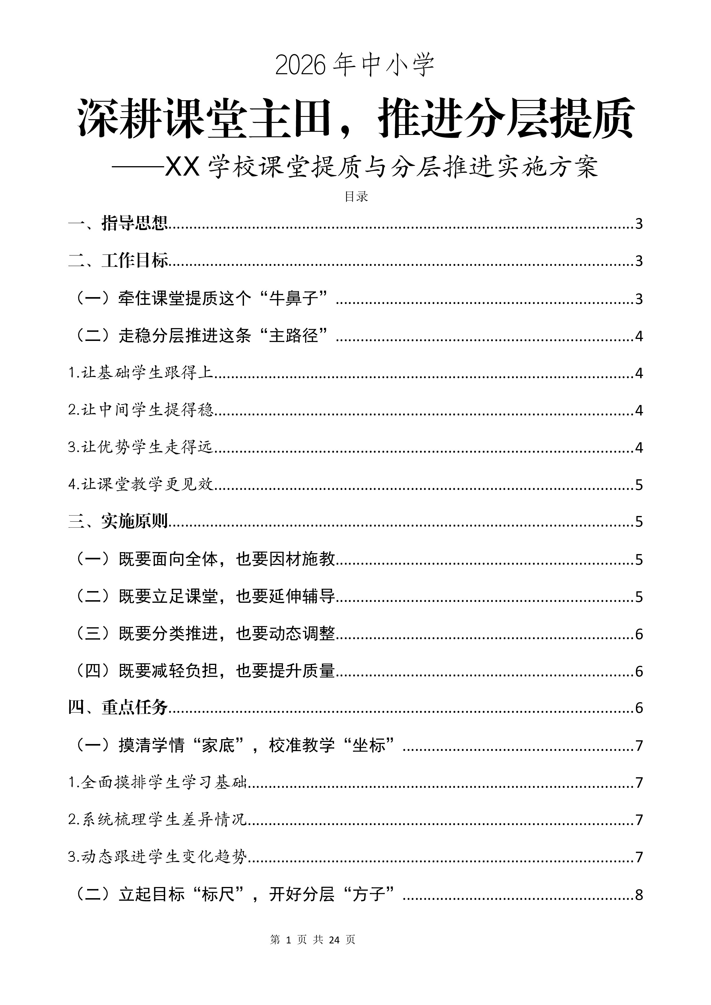 第1页共24页2026年中小学深耕课堂主田,推进分层提质——XX学校课堂提质与分层推进实施方案目录一、指导思想...............................................................................................................3二、工作目标...............................................................................................................3(一)牵住课堂提质这个“牛鼻子”....................................................