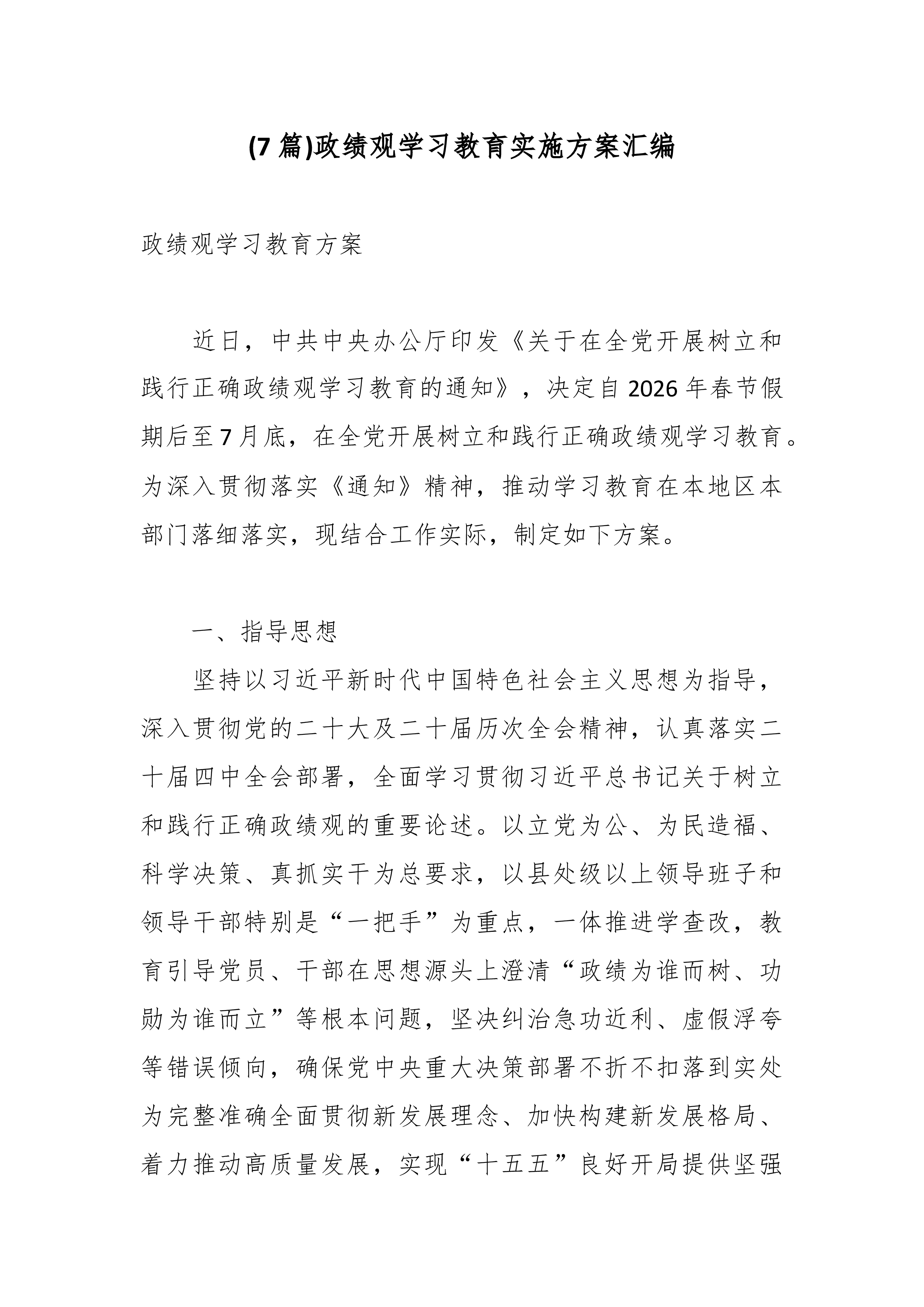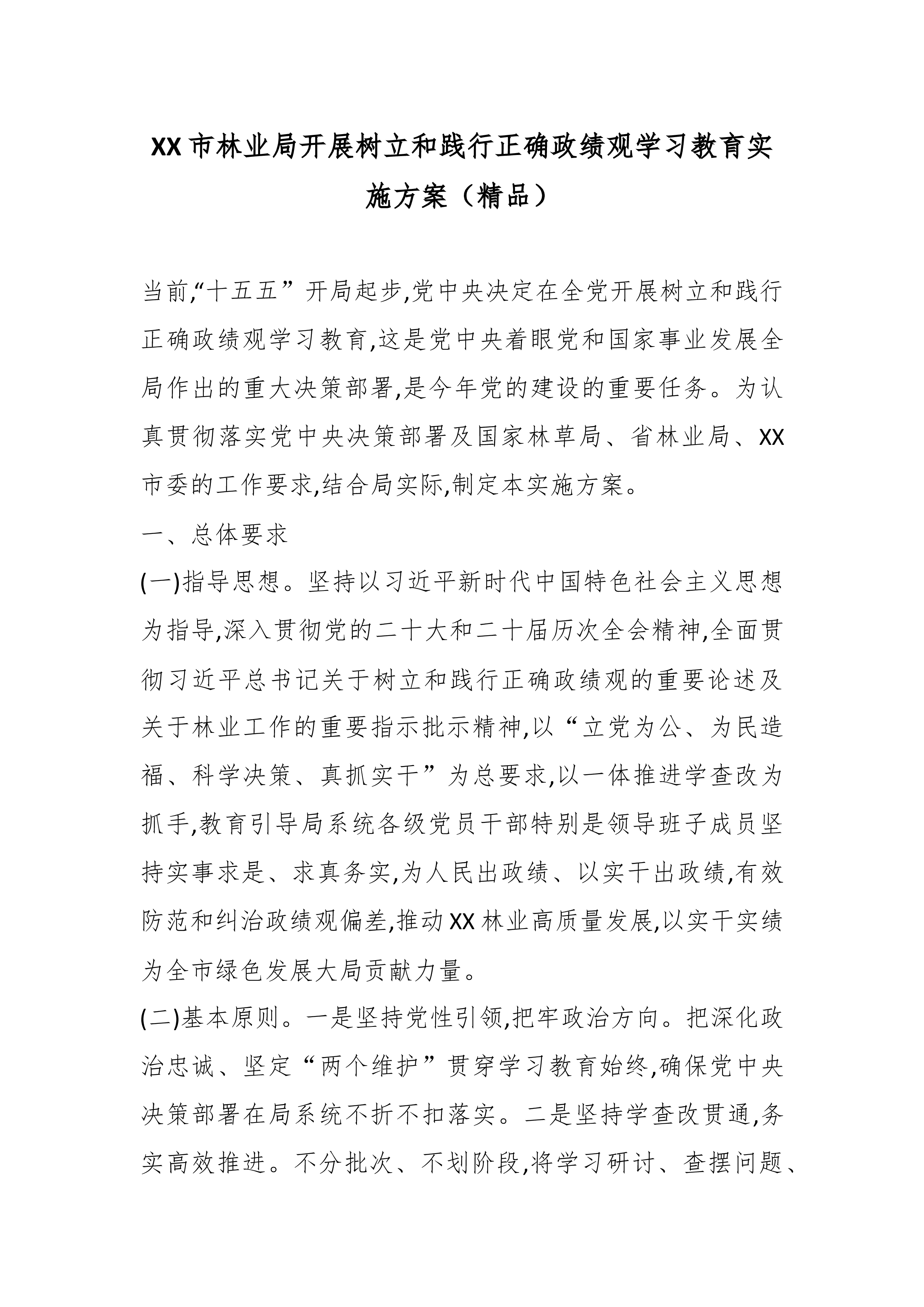 XX市林业局开展树立和践行正确政绩观学习教育实施方案(精品)当前,“十五五”开局起步,党中央决定在全党开展树立和践行正确政绩观学习教育,这是党中央着眼党和国家事业发展全局作出的重大决策部署,是今年党的建设的重要任务。为认真贯彻落实党中央决策部署及国家林草局、省林业局、XX市委的工作要求,结合局实际,制定本实施方案。一、总体要求(一)指导思想。坚持以习近平新时代中国特色社会主义思想为指导,深入贯彻党的二十大和二十届历次全会精神,全面贯彻习近平总书记关于树立和践行正确政绩观的重要论述及关于林业工作的重要指示批示精神,以“立党为公、为民造福、科学决策、真抓实干”为总要求,以一体推进学查改为抓手,教育引导局系统各级党员干部特别是领导班子成员坚持实事求是、求真务实,为人民出政绩、以实干出政绩,有效防范...