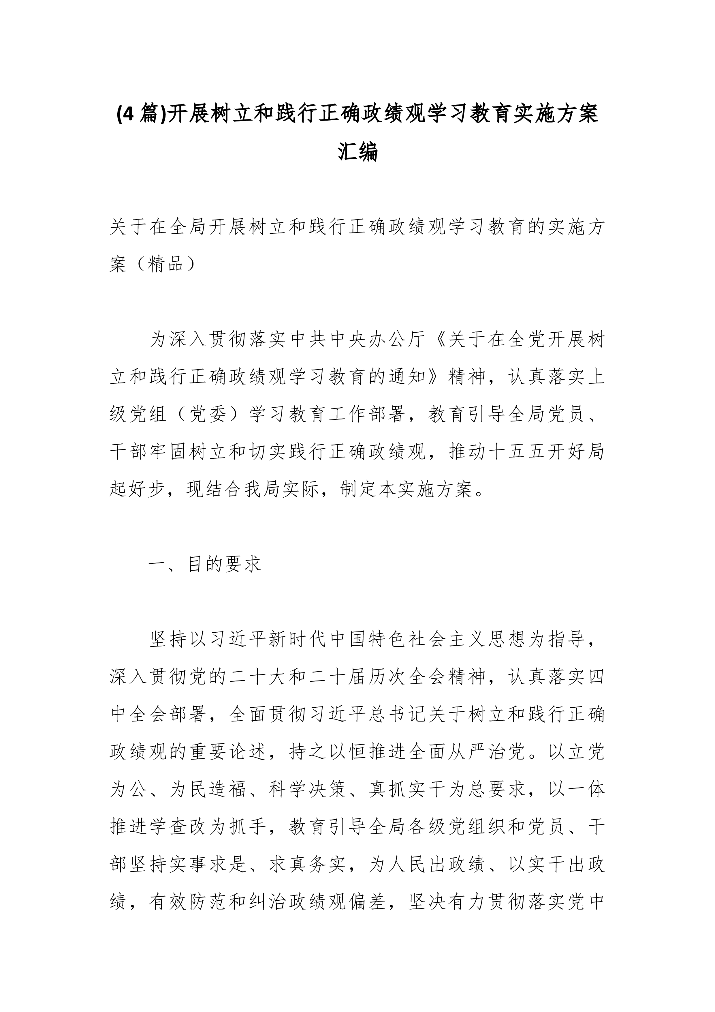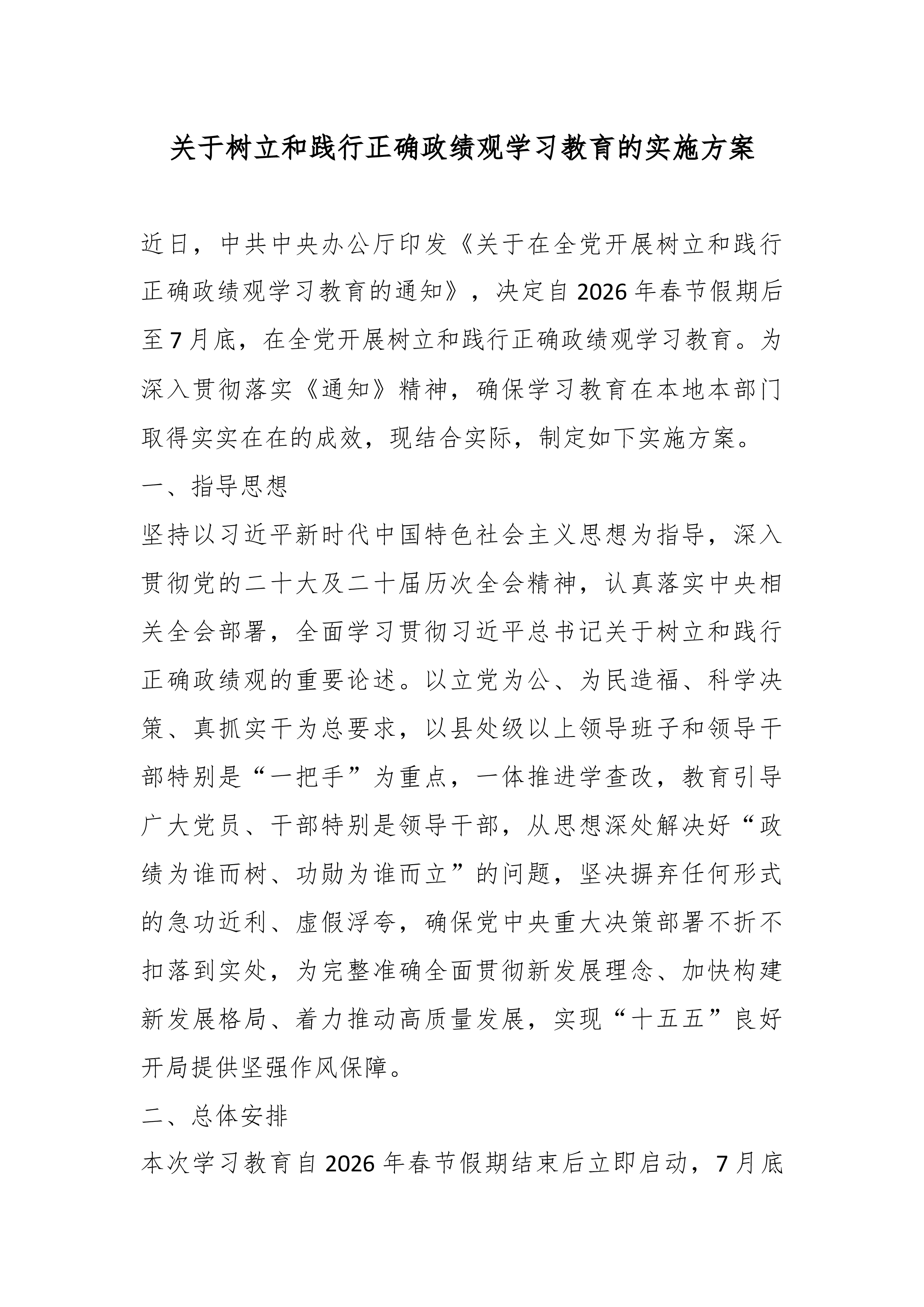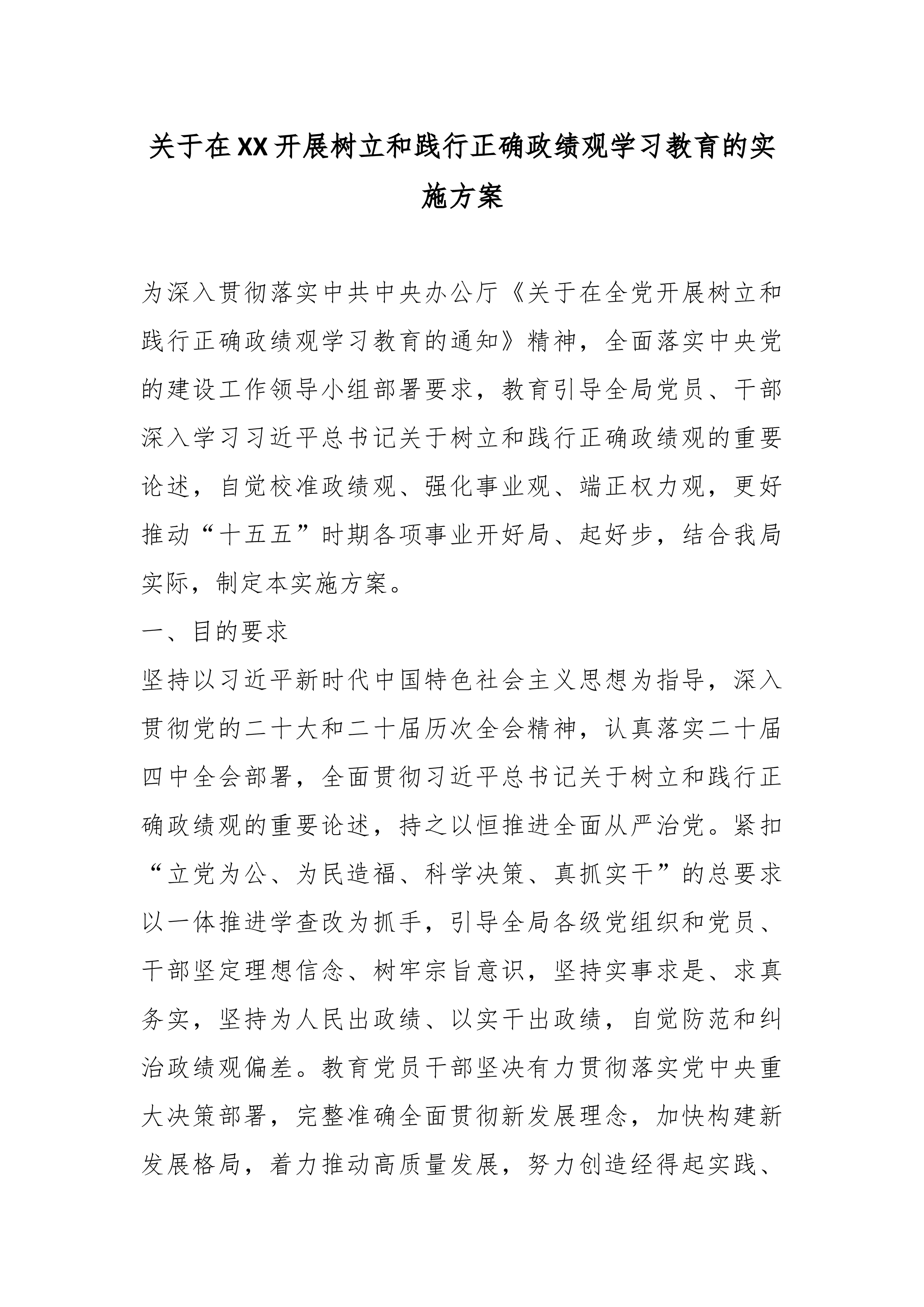 关于开展树立和践行正确政绩观学习教育的实施方案(精品)为深入贯彻习近平总书记关于树立和践行正确政绩观的重要论述精神,认真落实《中共中央办公厅关于在全党开展树立和践行正确政绩观学习教育的通知》和省委、市委部署要求,扎实推进本单位树立和践行正确政绩观学习教育各项工作,结合实际,制定本方案。一、总体要求坚持以习近平新时代中国特色社会主义思想为指导,全面贯彻党的二十大和二十届历次全会精神,认真落实党的二十届四中全会战略部署,深入学习贯彻习近平总书记关于树立和践行正确政绩观的重要论述,以"立党为公、为民造福、科学决策、真抓实干"为总要求,坚持学查改一体推进,聚焦深学、真查、实改,教育引导全体党员干部坚持实事求是、求真务实,为人民出政绩、以实干出政绩,有效防范和纠治政绩观偏差,创造经得起实践、人民、历史...