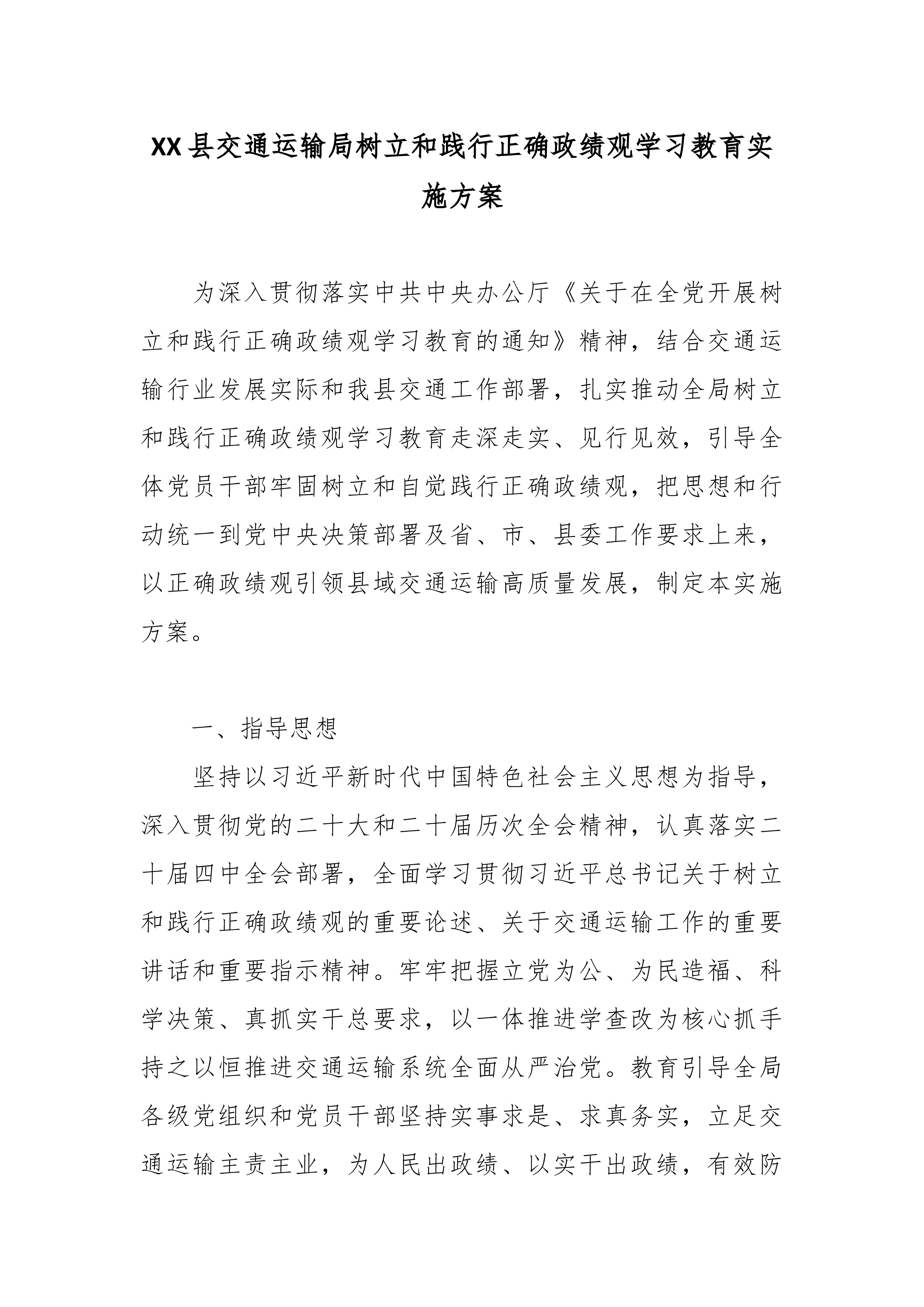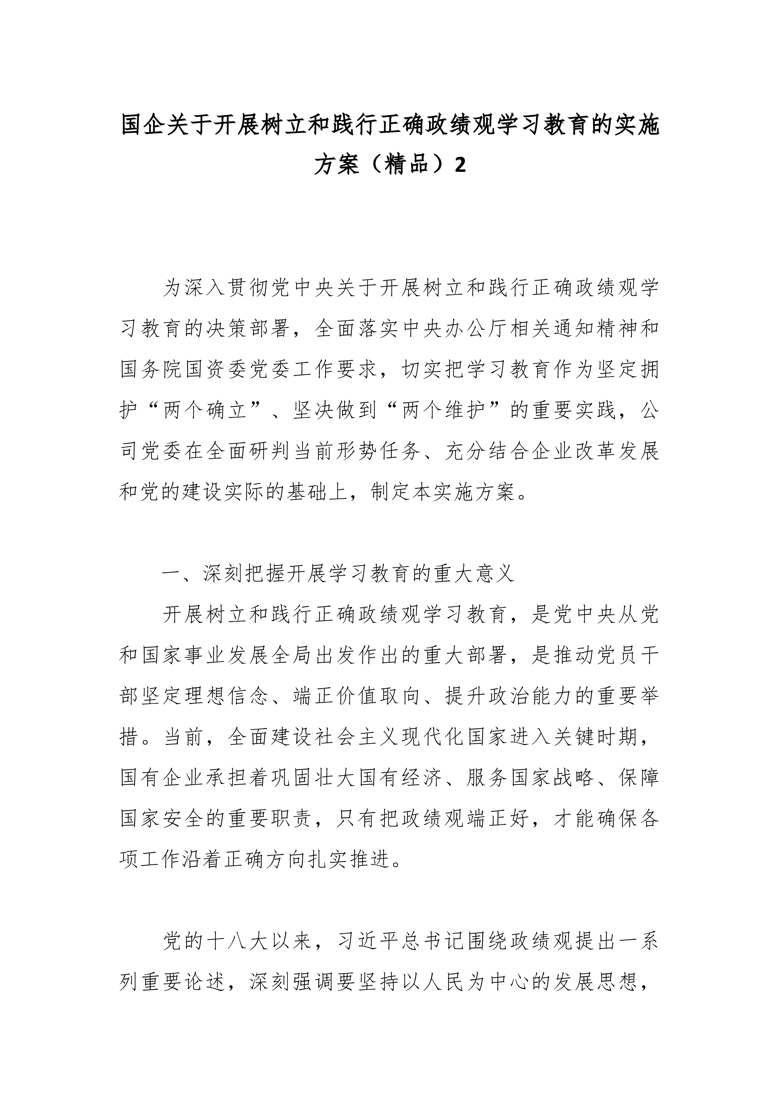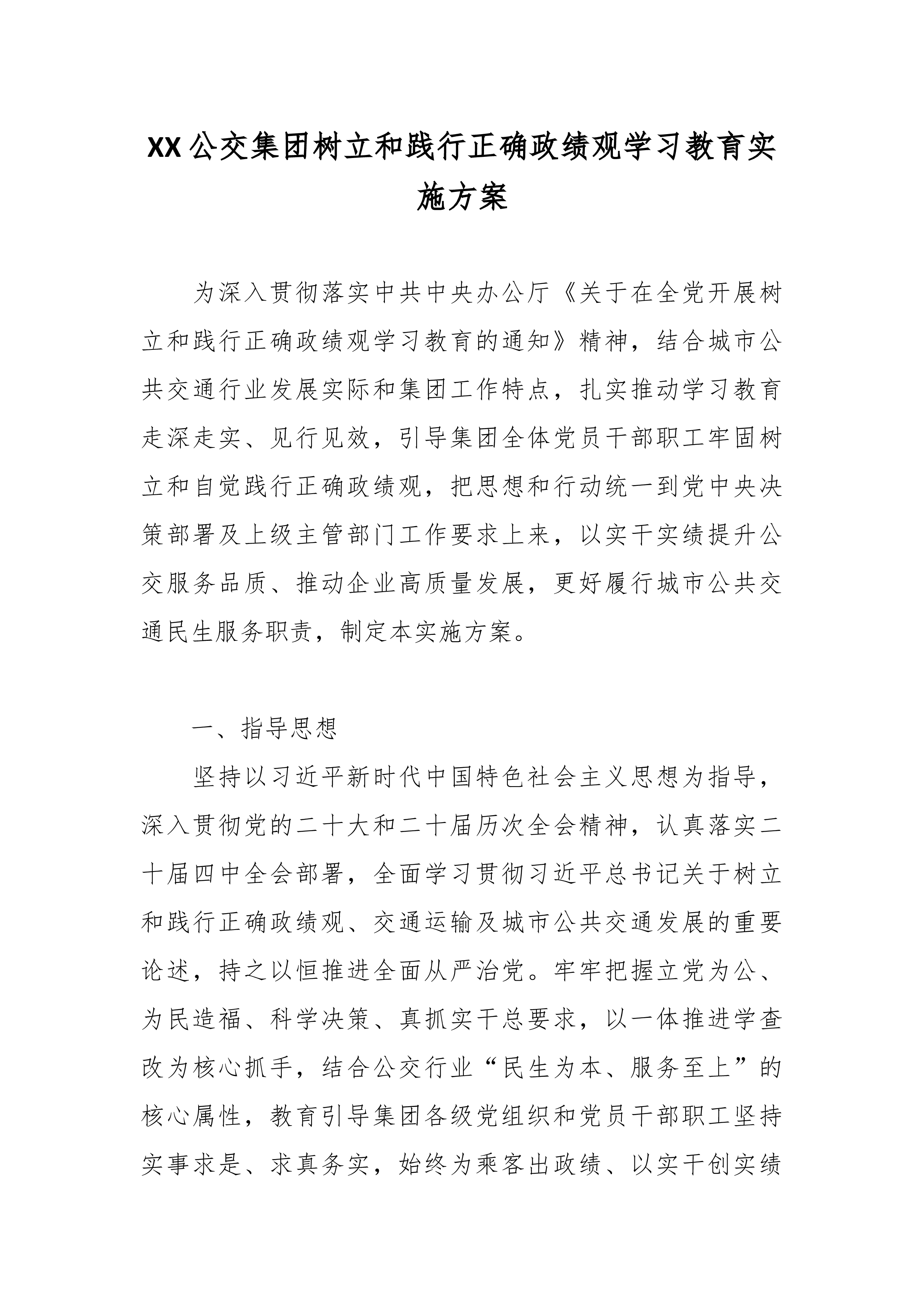 关于开展树立和践行正确政绩观学习教育的实施方案(精品)为深入贯彻习近平总书记关于树立和践行正确政绩观的重要论述精神,认真落实《中共中央办公厅关于在全党开展树立和践行正确政绩观学习教育的通知》和省委、市委部署要求,扎实推进本单位树立和践行正确政绩观学习教育各项工作,结合实际,制定本方案。一、总体要求坚持以习近平新时代中国特色社会主义思想为指导,全面贯彻党的二十大和二十届历次全会精神,认真落实党的二十届四中全会战略部署,深入学习贯彻习近平总书记关于树立和践行正确政绩观的重要论述,以"立党为公、为民造福、科学决策、真抓实干"为总要求,坚持学查改一体推进,聚焦深学、真查、实改,教育引导全体党员干部坚持实事求是、求真务实,为人民出政绩、以实干出政绩,有效防范和纠治政绩观偏差,创造经得起实践、人民、历史...