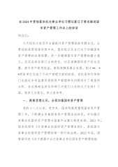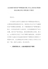 在全面提升国有资产管理效能专题工作会上的讲话(贯彻落实机关事业单位习惯过紧日子要求)同志们:今天组织大家召开全面提升资产管理效能专题会议,主要目的是贯彻落实党中央、国务院以及总行关于加强国有资产管理的决策部署,进一步强调国有资产管理的重大意义,压实各级各部门主体责任,切实保障国有资产安全完整,提升资产使用效益,高效保障某事业发展。刚才xx、xx两家单位交流了不动产管理方面的经验,省纪委和内审部门也就近年来监督发现的资产管理相关问题进行了通报和分析,在此感谢各单位和部门对我们工作的大力支持!下面,我讲几点意见,供大家参考。一、提高思想认识,全面加强国有资产管理党的十八大以来,党中央、国务院高度重...