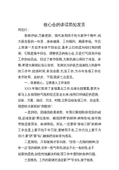 收心会的讲话简短发言同志们:新春伊始,万象更新。我代表局班子给大家拜个晚年,祝大家在新的一年里,身体健康、工作顺利、阖家幸福。节后上班第一天召开全体干部会议,基本上已经成为咱们局的惯例。它既是集中归位、调整状态的收心会,又是打气鼓劲开始工作的动员会。经过了春节假期,大家的身心得到了休息、休整,希望大家能以信心百倍、充满活力的状态迅速投入到新年的工作中,抢抓时间,务实创新,扎实工作,为今年各项工作任务开好局、起好步。下面,我讲三点意见。一、收假收心,立即进入工作状态XXX年我们安排了多项重点工作,任务比较繁重,要求大家马上从假期的气氛和状态里走出来,按照已经确定的思路、目标、方案、路径、方法、时...
