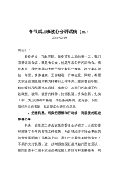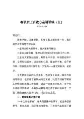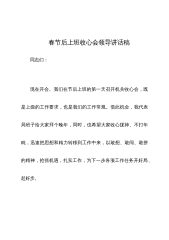 节后收心会领导讲话稿2021-09-27各位员工:首先,我给大家拜个晚年,祝大家在新的一年里,身体健康,工作顺利,万事如意,马到成功!今天是2月2日农历正月初三,从1月17日我们开发区召开了年终总结表彰大会至今近20天时间里,开发区领导考虑到大家在xxx年团结奋斗、努力拼搏,为保持全区经济总量和各项主要经济指标增长速度,连续四年雄踞全市首位付出了很多辛苦,于是给大家提供了一个相对松弛的工作环境,让大家放松一下绷紧了一年的神经,利用春节这个假期休息好、调整好。以更加饱满的精神面貌,更加高昂的工作干劲和更加积极的工作态势,全身心、满负荷地投入到xxx年的工作中去。同时,也给平时支持我们工作的家人以...