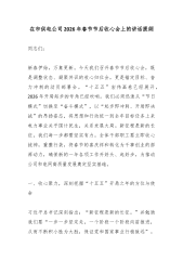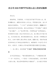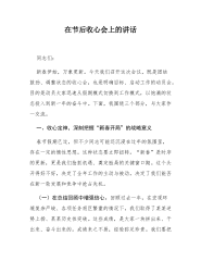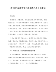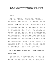XX乡镇党委书记在2026年春节后收心会上的讲话5同志们: 大家新年好! 今天,是农历丙午马年正月初八。我们在这里召开春节假期后的第一个全体会议,既是一个团结鼓劲、调整状态的收心会,也是一个明确目标、启动工作的动员会。首先,我代表镇党委、政府,再次向大家致以新春的问候和美好的祝福!祝愿大家在新的一年里,身体健康、工作顺利、阖家幸福、万事如意! 刚刚过去的春节假期,在大家的共同努力和坚守下,全镇社会大局和谐稳定,市场供应充足有序,节日氛围喜庆祥和,人民群众度过了一个安乐、祥和、温馨的新春佳节。这其中,离不开节日期间仍然坚守在值班值守、应急处突、民生保障等岗位上的同志们的辛勤付出。在此,我向大家道一声:辛苦了! “一年之计在于春”,春天是播种希望、谋划未来的季节。我们告别了己巳蛇年,迎来...