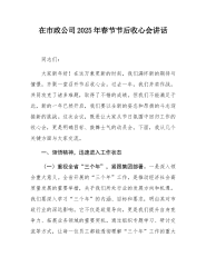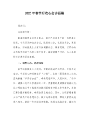在2025年春节上班收心会暨春训动员部署会上的讲话同志们:随着春节假期的圆满结束,我们再次相聚,踏上新的工作征程。在此,我代表**局党组,向各位同仁致以最真挚的新春祝福:愿大家身体健康,事业顺遂,家庭美满,万事如意!同时,我要特别向那些在节日期间坚守岗位,力保文旅市场秩序稳定的一线工作人员,致以崇高的敬意与谢意!今天,我们迎来了正月初九的开工日,持续秉持“春训强兵”的优良传统。这一传统不但是组织内部培训的延续,也是适应新时代发展要求的彰显,更是为我们冲刺“开门红”筑牢了坚实根基。让我们以此次春训为起点,净化思想,淬炼能力,以满腔的热忱和坚定的决心,谱写高质量发展的崭新篇章!接下来,我将结合实际...
