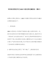 市财政局党组书记2025年度述责述廉报告(精品)按照会议要求,现将本人2025年度履行管党治党责任和廉洁自律情况报告如下:一、取得成效2025年是财政工作面临严峻挑战与重大机遇并存的一年。面对复杂的经济形势和繁重的改革发展任务,我始终牢记“财政部门首先是政治机关”的定位,团结带领局党组和全体党员干部,以政治建设为统领,以履职担当为己任,坚决推动全面从严治党向纵深发展,为全市经济社会高质量发展提供了坚实的财力保障和政治保证。(一)铸牢政治忠诚,在捍卫“两个确立”上做到绝对坚定我始终将执行党的政治纪律和政治规矩置于首位,确保财政工作始终沿着正确的政治方向前进。一是深化理论武装,把稳思想之舵。我坚持将习近平总书记重要讲话和重要指示批示精神作为“第一议题”和党组理论学习中心组学习的核心内容。全年组织...