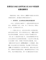 县委党史与地方志研究室主任2025年度述职述德述廉报告根据县委统一安排,现将本人2025年度履行岗位职责、加强党性修养、落实廉洁自律情况报告如下:一、恪尽职守,全力推动史志事业高质量发展一年来,在县委的正确领导下,我团结带领研究室全体同志,紧紧围绕“存史、资政、育人”根本任务,聚焦主责主业,扎实推进各项工作。(一)聚焦主责主业,在深化党史研究上取得新进展。始终坚持党史姓党、党史为党的政治方向。一是系统推进党史资料征集编纂。全面启动《中国共产党XX县历史(第三卷)》基础资料长编工作,系统收集整理改革开放以来全县经济社会发展的原始档案、口述史料及专题文献,已完成XX个专题、约XX万字的资料汇编初稿。完成《XX县改革开放实录(1978-2012)》专题编研,精选XX个标志性事件进行深度挖掘,形成X...